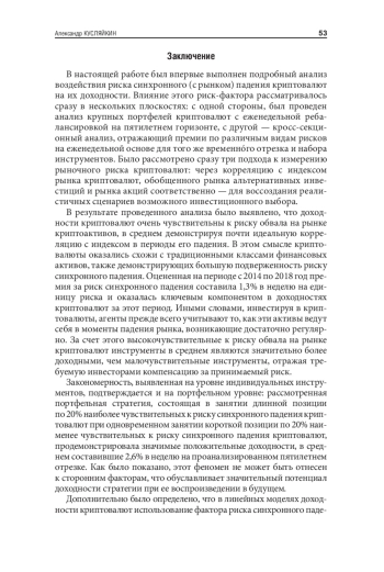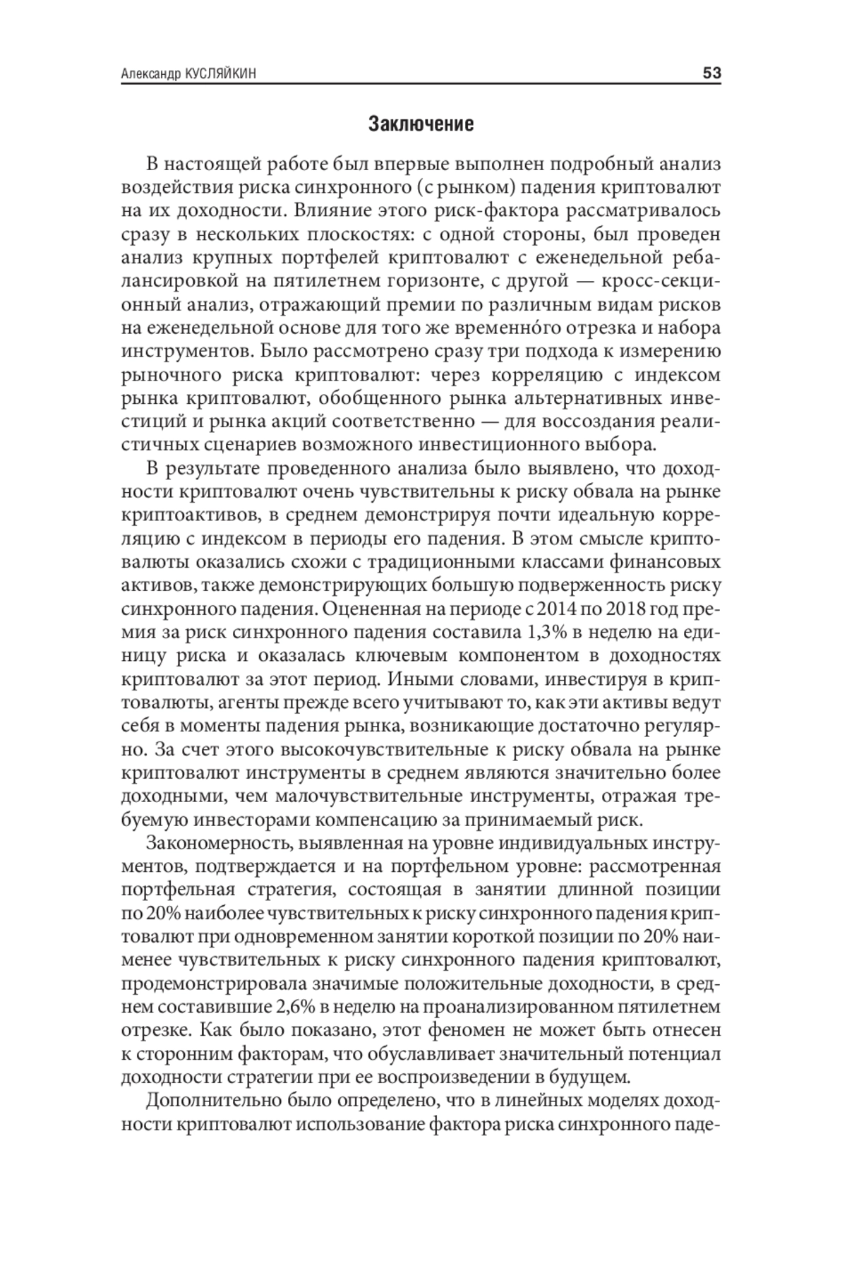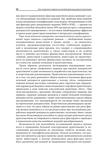 Какую роль в формировании доходности криптовалют играет фактор риска синхронного падения — обесценения отдельных криптовалют и портфелей при падении рынка в целом? Ответу на этот вопрос посвящена настоящая работа. Исследование строится на недельных данных за 2014–2018 годы и охватывает свыше 900 криптовалют. Эмпирическая часть содержит регрессионный анализ, рассматривающий сразу три подхода к измерению систематического риска криптовалют, соответствующих различным положениям криптоактивов в портфелях инвесторов. В рамках этого оцениваются индивидуальные коэффициенты чувствительности криптовалют к рискам, строятся факторные портфели и тестируются портфельные стратегии, проводится кросс-секционный анализ с определением значимых риск-премий — всего более 315 тысяч регрессионных итераций. В результате выявлено, что криптоактивы очень чувствительны к риску обвала на рынке криптовалют, но нечувствительны к происходящему на рынке акций, а также на рынках, относящихся к альтернативным инвестициям, сохраняя свою автономность. Более подверженные риску синхронного падения инструменты в среднем являются более доходными, причем данная закономерность обнаруживается как на уровне отдельных инструментов, так и на уровне крупных портфелей криптовалют и не может быть отнесена к ненаблюдаемым факторам. Усредненная премия за риск синхронного падения составила 1,3% в неделю и оказалась ключевым компонентом доходностей криптовалют. Таким образом, высокие доходности криптоактивов являются лишь компенсацией за соответствующие высокие риски синхронного падения. Одновременно в исследовании подтверждается значимость факторов SMB и WML, отражающих надбавки за риски малой капитализации и высоких прошлых доходностей соответственно, для доходностей криптоактивов и предлагается трехфакторная модель, успешно объясняющая более 50% кросс-секционных доходностей криптовалют, превосходя уже представленные в литературе модели. Полученные результаты могут применяться в рамках дальнейших теоретических исследований, посвященных доходностям криптовалют, и в ходе управления инвестициями в криптовалюты портфельными менеджерами и индивидуальными инвесторами.