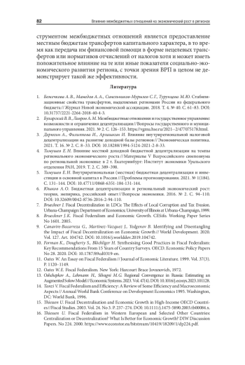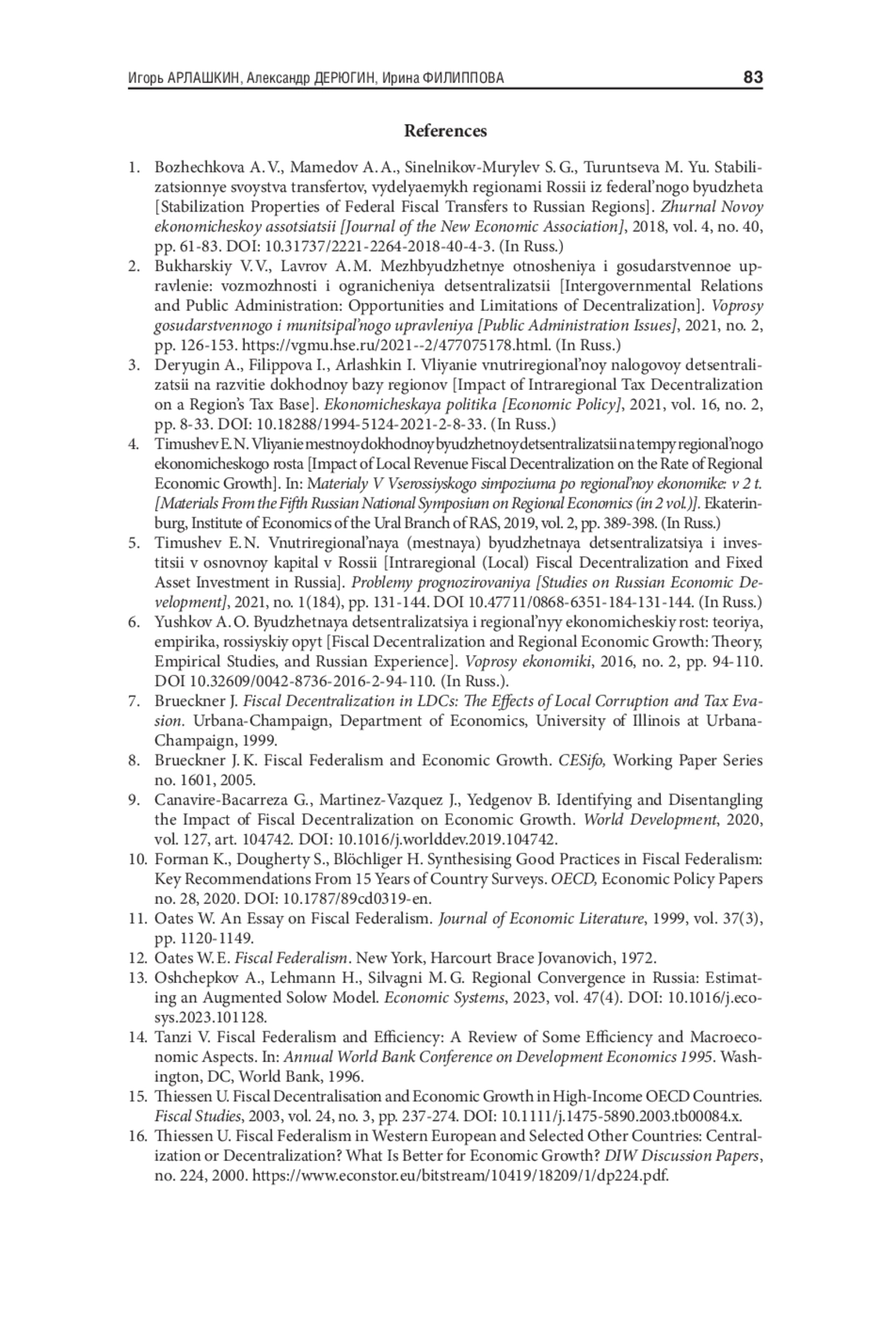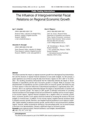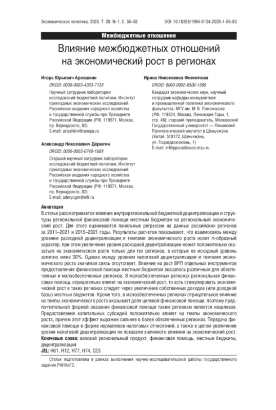 АРЛАШКИН И. Ю., ФИЛИППОВА И. Н., ДЕРЮГИН А. Н. ВЛИЯНИЕ МЕЖБЮДЖЕТНЫХ ОТНОШЕНИЙ НА ЭКОНОМИЧЕСКИЙ РОСТ В РЕГИОНАХ // ЭКОНОМИЧЕСКАЯ ПОЛИТИКА. 2025. ТОМ 20, № 1