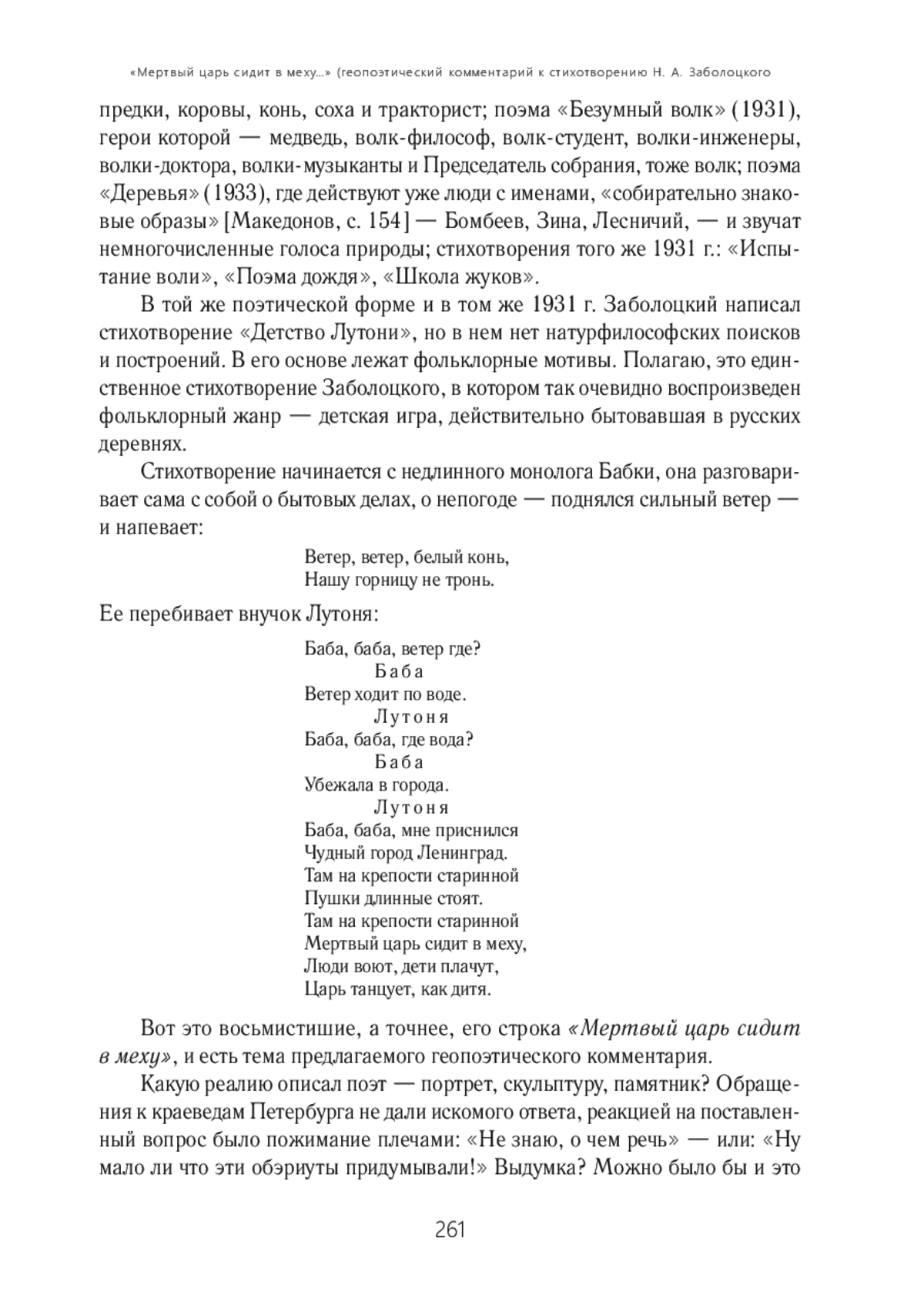 Предмет исследования — стихотворение Н. А. Заболоцкого «Детство Лутони» в аспекте его геопоэтики. В литературоведческих работах о поэте это стихотворение не упоминается. А оно интересно еще и тем, что это единственное произведение Заболоцкого, выполненное в соотнесении с традиционными образами и жанрами русского фольклора: детскими играми и сказками, действительно бытовавшими в крестьянских семьях. Итог краеведческих разысканий автора будет неожиданым даже для жителей Петербурга: мало кто из них знает, как разгадать загадочную строку поэта: «Мертвый царь сидит в меху» — о предмете, который стал наряду с другими скульптурными атрибутами в изображении самодержца символом утверждения русской государственной власти.