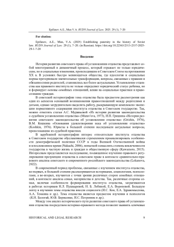 История развития советского права об установлении отцовства представляет собой многогранный и динамичный процесс, который отражает не только юридические, но и социальные изменения, происходившие в Советском Союзе на протяжении XX в. В условиях быстро меняющегося общества, где идеология и социальные нормы претерпевали значительные трансформации, вопросы, связанные с правами и обязанностями родителей, становились все более актуальными. Установление отцовства как правового института не только определяет юридический статус ребенка, но и формирует основы семейных отношений, влияя на социальные практики и правосознание граждан.