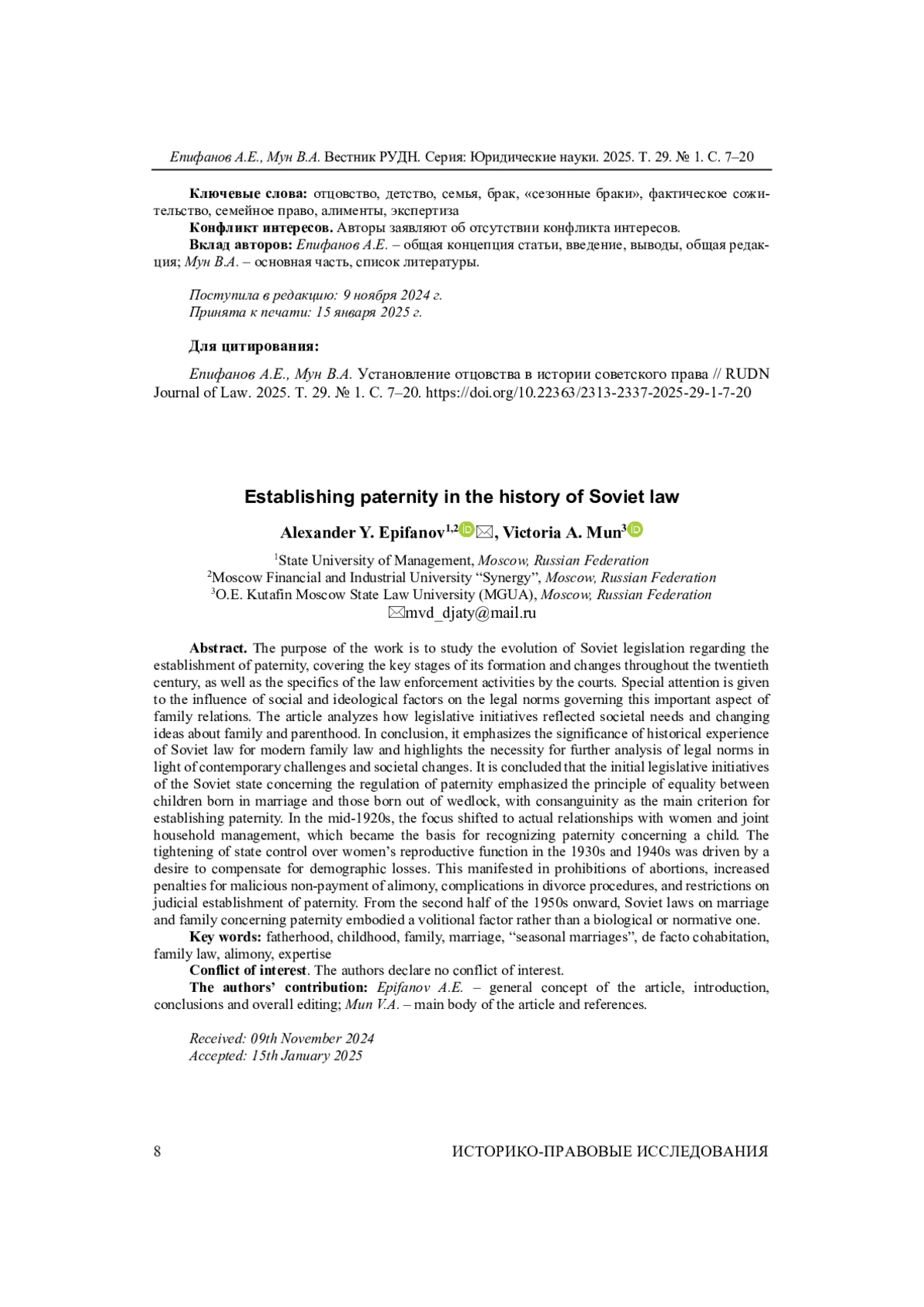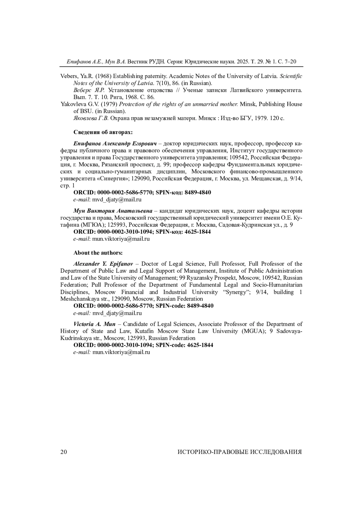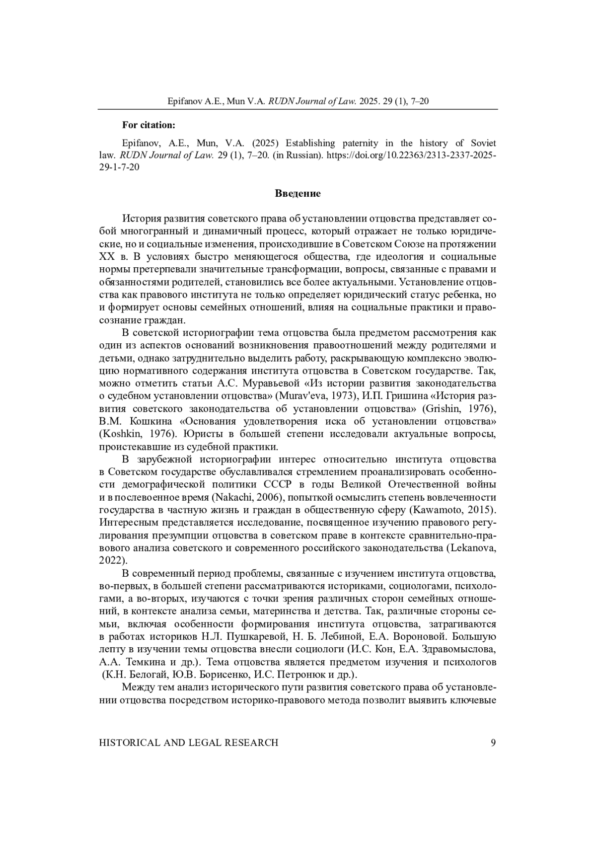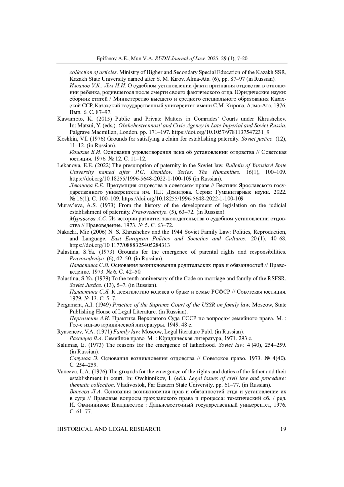10. 	Леканова Е.Е. Презумпция отцовства в советском праве // Вестник Ярославского государственного университета им. П.Г. Демидова. Серия: Гуманитарные науки. 2022. № 16(1). С. 100-109. DOI: 10.18255/1996-5648-2022-1-100-109 EDN: NYBXKQ