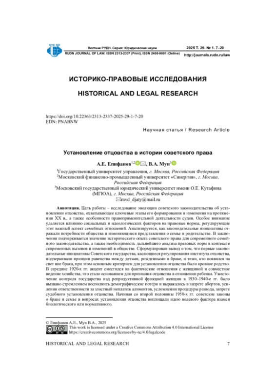 Цель работы - исследование эволюции советского законодательства об установлении отцовства, охватывающее ключевые этапы его формирования и изменения на протяжении XX в., а также особенности правоприменительной деятельности судов. Особое внимание уделяется влиянию социальных и идеологических факторов на правовые нормы, регулирующие этот важный аспект семейных отношений. Анализируется, как законодательные инициативы отражали потребности общества и изменяющиеся представления о семье и родительстве. В заключении подчеркивается значение исторического опыта советского права для современного семейного законодательства, а также необходимость дальнейшего анализа правовых норм в контексте современных вызовов и изменений в обществе. Сформулирован вывод о том, что первые законодательные инициативы Советского государства, касающиеся регулирования института отцовства, подчеркивали принцип равенства между детьми, рожденными в браке, и теми, кто появился на свет вне брака, при этом основным критерием для установления отцовства было кровное родство. В середине 1920-х гг. акцент сместился на фактические отношения с женщиной и совместное ведение хозяйства, что стало основанием для признания отцовства в отношении ребенка. Ужесточение контроля государства над репродуктивной функцией женщин в 1930-1940-е гг. было вызвано стремлением восполнить демографические потери и выражалось в запрете абортов, усилении ответственности за злостный неплатеж алиментов, усложнении процедуры развода, запрете судебного установления отцовства. Начиная со второй половины 1950-х гг. советские законы о браке и семье в вопросах установления отцовства воплощали идею волевого фактора взамен биологического или нормативного.