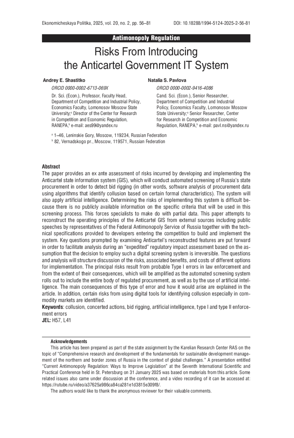 20. Katsoulacos Y., Avdasheva S., Golovanova S. Determinants of the (Slow) Development of Effect-Based Competition Enforcement: Testing the Impact of Judicial Review on the Choice of Legal Standards by Competition Authorities // Journal of Industry, Competition and Trade. 2021. Vol. 21. No 1. P. 103-122.