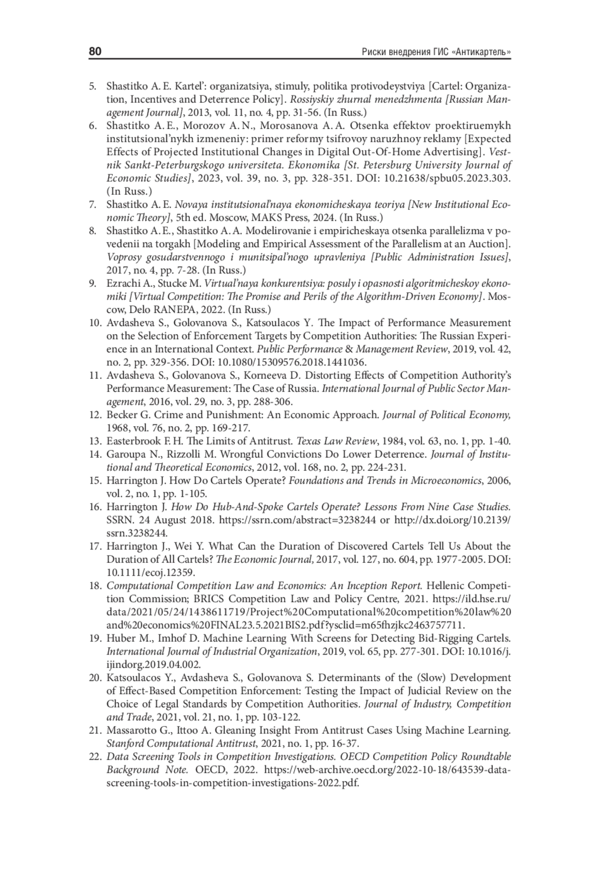 10. Avdasheva S., Golovanova S., Katsoulacos Y. The Impact of Performance Measurement on the Selection of Enforcement Targets by Competition Authorities: The Russian Experience in an International Context // Public Performance & Management Review. 2019. Vol. 42. No 2. P. 329-356. https://doi.org/10.1080/15309576.2018.1441036.