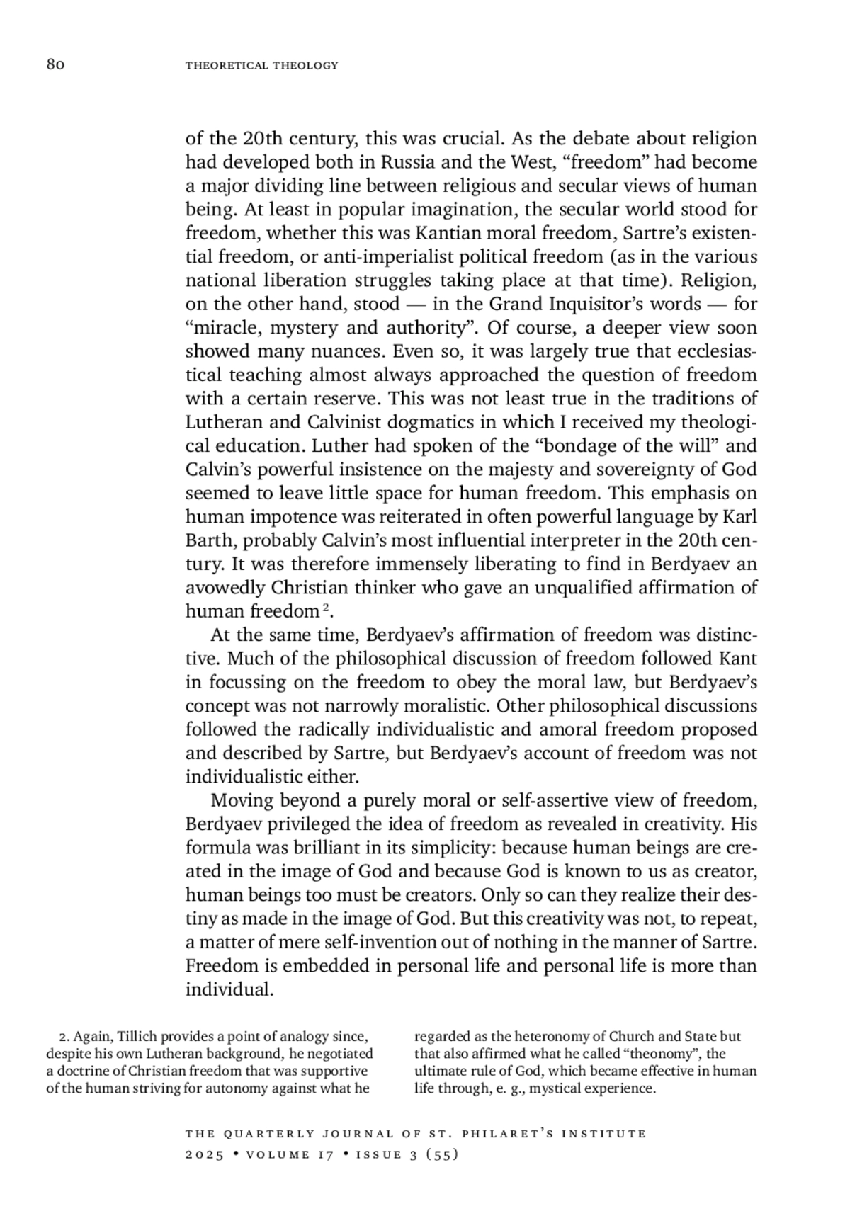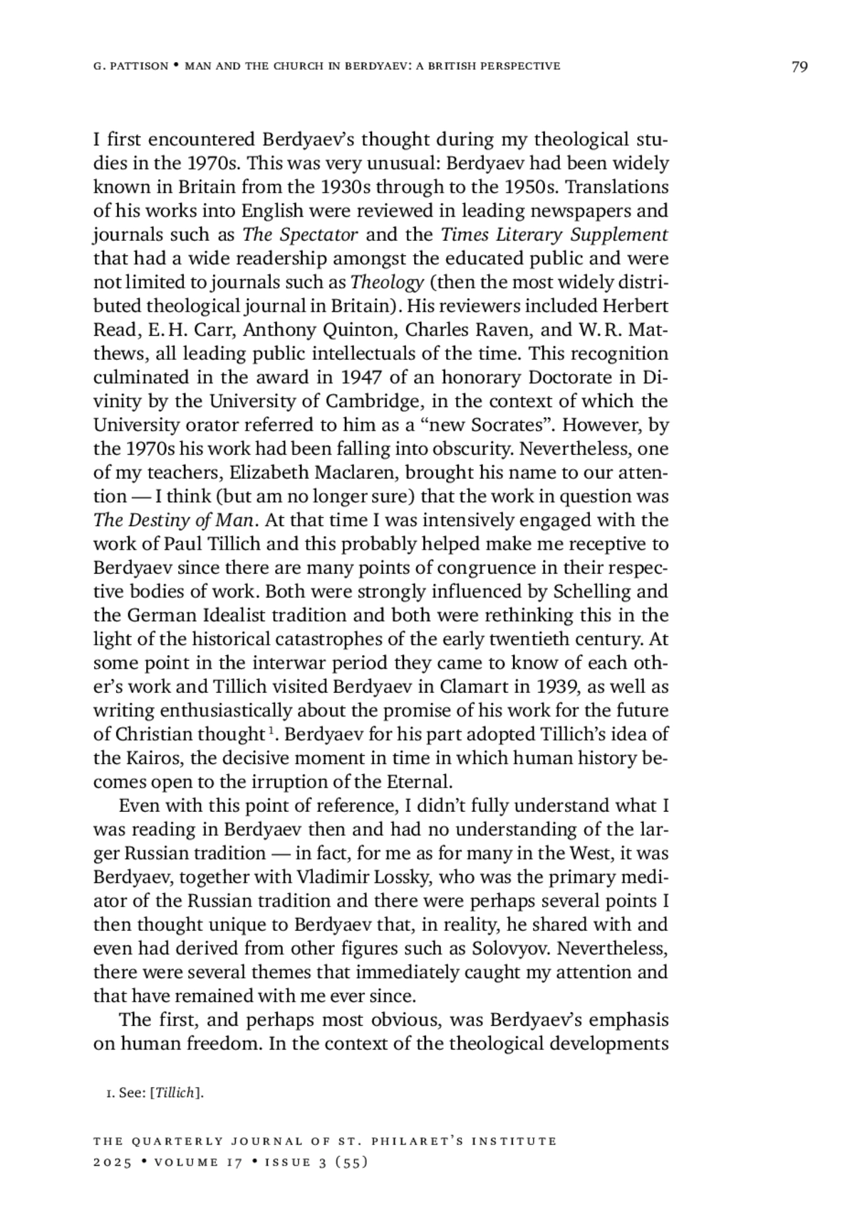 В статье рассматривается отношение к Бердяеву в Великобритании и отмечается, что после широкого признания в 1930-х и 1940-х годах репутация Бердяева постепенно ухудшалась в течение следующих тридцати лет. Автор рассказывает о том, как он впервые познакомился с идеями Бердяева в 1970-х годах и какие параллели он обнаружил с идеями Тиллиха, отметив, что оба философа находились под влиянием Шеллинга и творчески переосмысливали немецкий идеализм. Вместе с В. Лосским Бердяев был одним из главных проводников русской традиции того времени. Особенно привлекательным в его работах было представление о свободе, которое было более радикальным, чем то, что обычно встречалось в богословских трудах, но при этом избегало произвольности Сартра, делая акцент на контекстуализации свободы в соборности, творчестве и космической жизни. В статье отмечаются христоцентрические и эсхатологические аспекты мировоззрения Бердяева, которые были важны для развития его философии и истории, а также напряжение между определённым дуализмом (как в диалектике рабства и свободы) и целостностью божественно-человечески-космического синтеза. В заключение статьи приводятся размышления о том, что бердяевское понятие русской идеи продуктивно не только в отношении русского национализма, но и для экуменического видения, которое даёт надежду на христианское обновление в эпоху тоталитаризма.