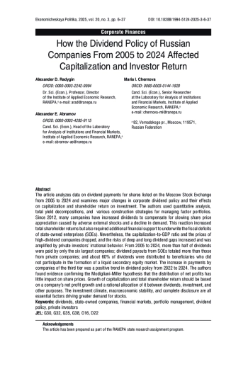 В статье на основе данных о дивидендных выплатах по акциям, обращавшимся на Московской бирже в 2005–2024 годах, анализируются ключевые тренды дивидендной политики компаний и их влияние на капитализацию и доходность вложений акционеров. Использованы методы количественного анализа, декомпозиции общей доходности и построения факторных стратегий портфельного управления. С 2012 года компании проводили активную дивидендную политику для компенсации замедления роста курсовой доходности акций из-за неблагоприятных внешних шоков и снижения спроса на указанные акции. Это позволило повысить общую доходность акционеров, а в случае компаний с государственным участием — привлечь дополнительные средства в бюджет. В то же время наблюдалось снижение капитализации относительно ВВП и курсовой стоимости акций с высокой дивидендной доходностью, а также рост риска глубоких и продолжительных дивидендных гэпов, сопровождавшихся нерациональным поведением частных инвесторов. В 2005–2024 годах более половины выплачиваемых дивидендов приходилось всего на шесть крупнейших компаний, дивидендные выплаты компаний с государственным участием были значительно больше, чем у частных компаний, около 60% дивидендов было распределено в пользу бенефициаров, не участвовавших в формировании ликвидного вторичного рынка акций. Позитивным трендом дивидендной политики в 2022–2024 годах стал рост выплат компаниями третьего эшелона. Авторы статьи обнаружили подтверждение гипотезы Модильяни — Миллера, что пропорции распределения чистой прибыли не могут в полной мере определять стоимость акций. Рост капитализации и общая доходность акционеров должны опираться на увеличение чистой прибыли компаний и ее рациональное распределение между дивидендами, инвестициями и иными целями. Важную роль в повышении спроса на акции играют благоприятный инвестиционный климат, макроэкономическая стабильность и полноценное раскрытие информации об эмитентах.