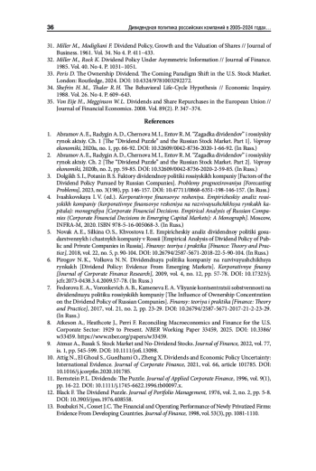 1. Абрамов А. Е., Радыгин А. Д., Чернова М. И., Энтов Р. М. «Загадка дивидендов» и российский рынок акций. Ч. 1 // Вопросы экономики. 2020a. № 1. С. 66-92. https://doi.org/10.32609/0042-8736-2020-1-66-92.