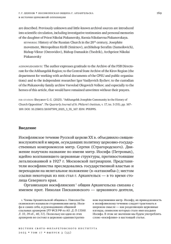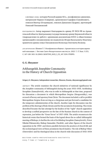 В статье изучаются церковные инициативы общероссийского масштаба, исходившие от иосифлянской общины г. Архангельска в 1933-1935 гг. Архи епископ Серафим (Самойлович), находившийся в это время в ссылке в Архангельске, предложил к обсуждению документ, в котором заместитель патриаршего местоблюстителя митр. Сергий (Страгородский) обвинялся в ереси и отступничестве от Христа. В документе звучал призыв запретить митр. Сергия в священнослужении и выдвигалась кандидатура временно управляющего церковью. Другой темой для обсуждения стала проблема нехватки святого мира, используемого для таинства миропомазания. Описываемые события стали последней попыткой лидеров «правой» церковной оппозиции выработать единый взгляд на судьбы Российской церкви в условиях гонений накануне «большого террора» 1937-1938 гг. В статье реконструируются исторические события, ставшие основой легенды о так называемом Архангельском совещании архиереев; уточняется роль архиеп. Серафима (Самойловича), прот. Николая Пискановского, еп. Дамаскина (Цедрика) и других действующих лиц церковной оппозиции 1930-х гг.; проводятся параллели между практикой церковной жизни и экклезиологическими взглядами этих выдающихся церковных деятелей. Описывается роль еп. Виктора (Островидова) и его богословских идей в общецерковной дискуссии 1933-1934 гг. В научный оборот вводятся ранее неизвестные и малоизвестные архивные источники, среди которых следственные показания и личные воспоминания дочери прот. Николая Пискановского - Ксении Николаевны Пискановской.