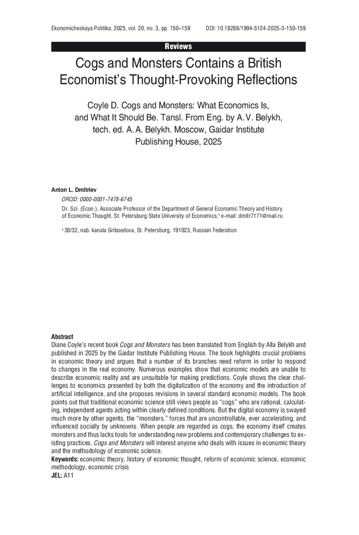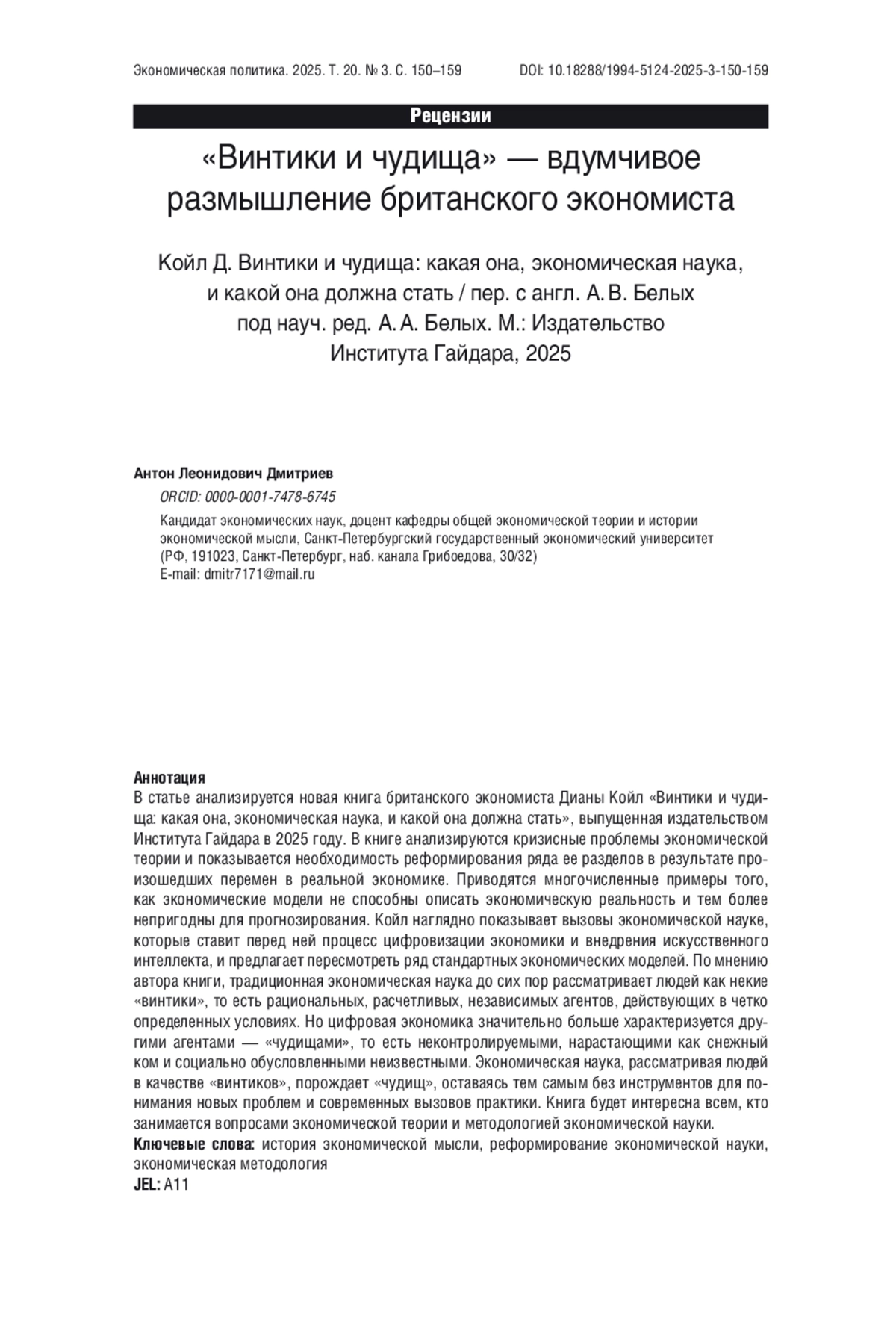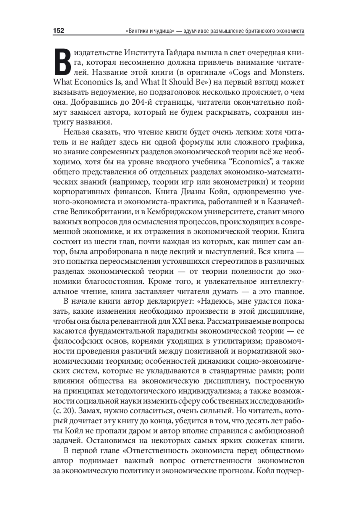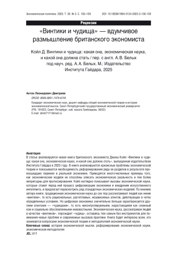В статье анализируется новая книга британского экономиста Дианы Койл «Винтики и чудища: какая она, экономическая наука, и какой она должна стать», выпущенная издательством Института Гайдара в 2025 году. В книге анализируются кризисные проблемы экономической теории и показывается необходимость реформирования ряда ее разделов в результате произошедших перемен в реальной экономике. Приводятся многочисленные примеры того, как экономические модели не способны описать экономическую реальность и тем более непригодны для прогнозирования. Койл наглядно показывает вызовы экономической науке, которые ставит перед ней процесс цифровизации экономики и внедрения искусственного интеллекта, и предлагает пересмотреть ряд стандартных экономических моделей. По мнению автора книги, традиционная экономическая наука до сих пор рассматривает людей как некие «винтики», то есть рациональных, расчетливых, независимых агентов, действующих в четко определенных условиях. Но цифровая экономика значительно больше характеризуется другими агентами — «чудищами», то есть неконтролируемыми, нарастающими как снежный ком и социально обусловленными неизвестными. Экономическая наука, рассматривая людей в качестве «винтиков», порождает «чудищ», оставаясь тем самым без инструментов для понимания новых проблем и современных вызовов практики. Книга будет интересна всем, кто занимается вопросами экономической теории и методологией экономической науки.