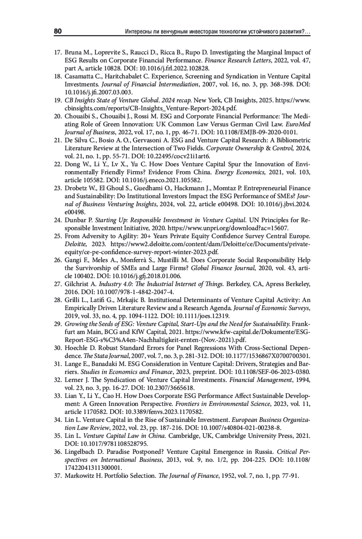 31. Lange E., Banadaki M. ESG Consideration in Venture Capital: Drivers, Strategies and Barriers // Studies in Economics and Finance. 2023. Preprint. https://doi.org/10.1108/SEF-06-20230380.