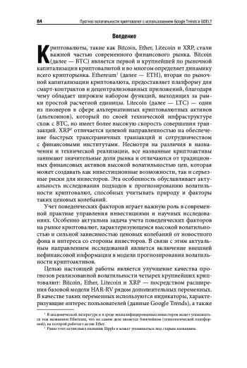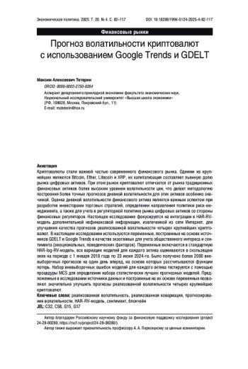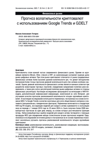 Криптовалюты стали важной частью современного финансового рынка. Одними из крупнейших являются Bitcoin, Ether, Litecoin и XRP, их капитализация составляет львиную долю рынка цифровых активов. При этом рынок криптовалют отличается от рынка традиционных финансовых активов более высоким уровнем волатильности цен, что делает методологию построения более точных прогнозов дневной волатильности для этих активов особенно значимой. Оценка дневной волатильности финансового актива является важным аспектом при разработке инвесторами торговых стратегий, определении направления политики риск-менеджмента, а также для учета в регуляторной политике рынка цифровых активов со стороны финансовых регуляторов. Настоящее исследование фокусируется на интеграции в HAR-RVмодель дополнительной нефинансовой информации, извлеченной из сети Интернет, для улучшения качества прогнозов реализованной волатильности четырех крупнейших криптовалют. В настоящем исследовании используются переменные, построенные на основе источников GDELT и Google Trends в качестве экзогенных для учета общественного интереса и сентимента (эмоциональных, поведенческих факторов). Переменные включаются в стандартную HAR-log-RV-модель, все вариации моделей для каждого актива оцениваются в скользящем окне на периоде с 1 января 2018 года по 23 июня 2024-го. Было получено более 2000 вневыборочных прогнозов на один день вперед, на основе которых рассчитываются функции потерь. Набор вневыборочных ошибок моделей для каждого актива тестируется с помощью процедуры MCS для определения набора статистически лучших прогнозных моделей. Предложенные в исследовании источники данных и построенные на их основе переменные позволяют значительно улучшить прогнозы реализованной волатильности четырех крупнейших криптовалют.