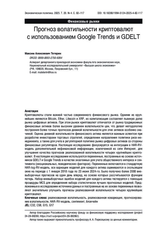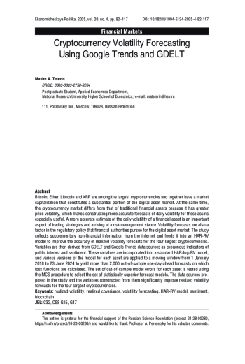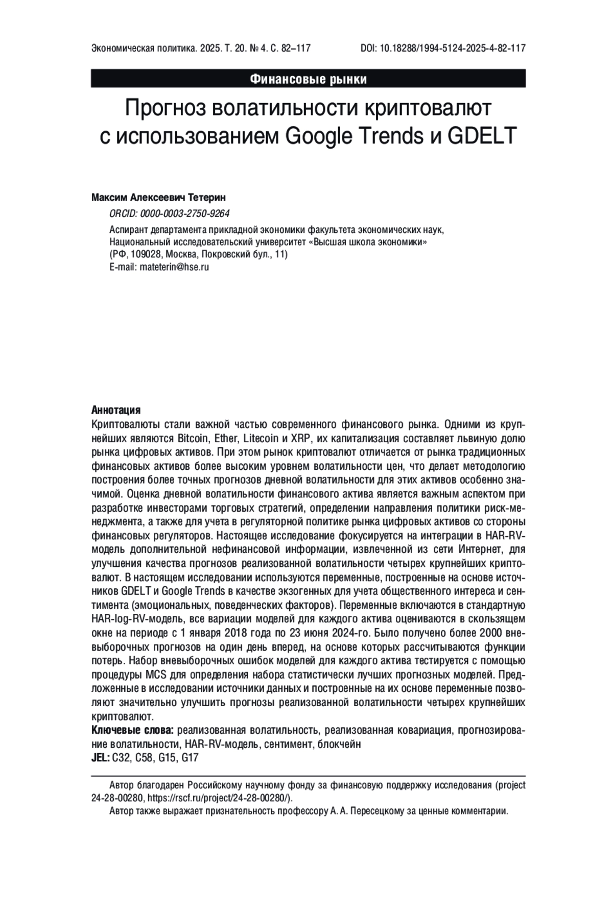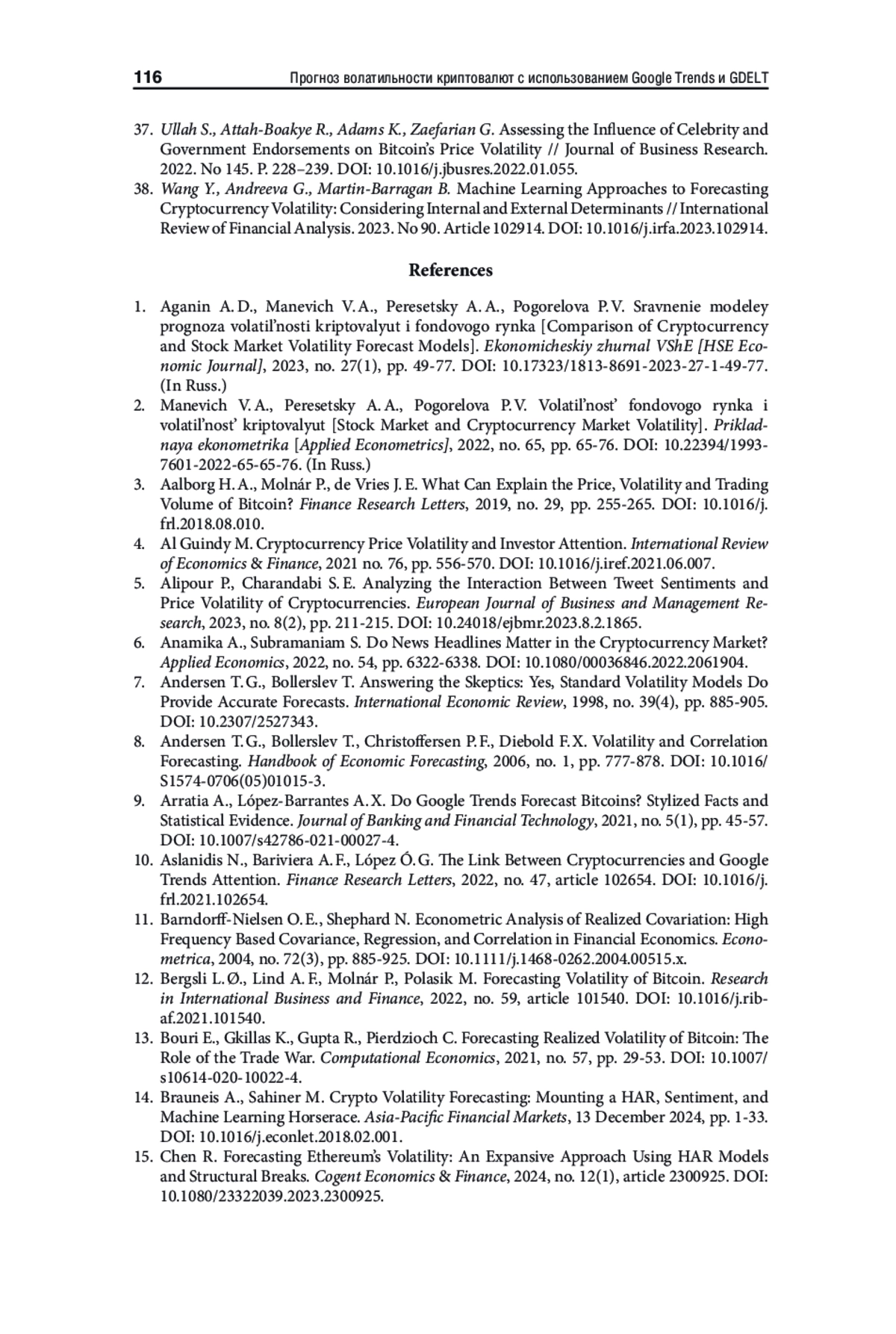 35. Teterin M., Peresetsky A. Google Trends and Bitcoin Volatility Forecast // Journal of the New Economic Association. 2024. No 4(65). P. 118-135. https://doi.org/10.31737/22212264_2024_4_118-135.