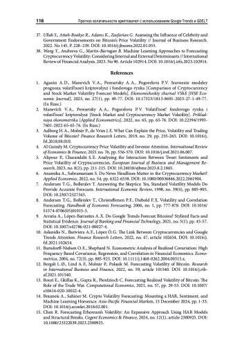 1. Аганин А. Д., Маневич В. А., Пересецкий А. А., Погорелова П. В. Сравнение моделей прогноза волатильности криптовалют и фондового рынка // Экономический журнал ВШЭ. 2023. № 27(1). С. 49-77. https://doi.org/10.17323/1813-8691-2023-27-1-49-77.