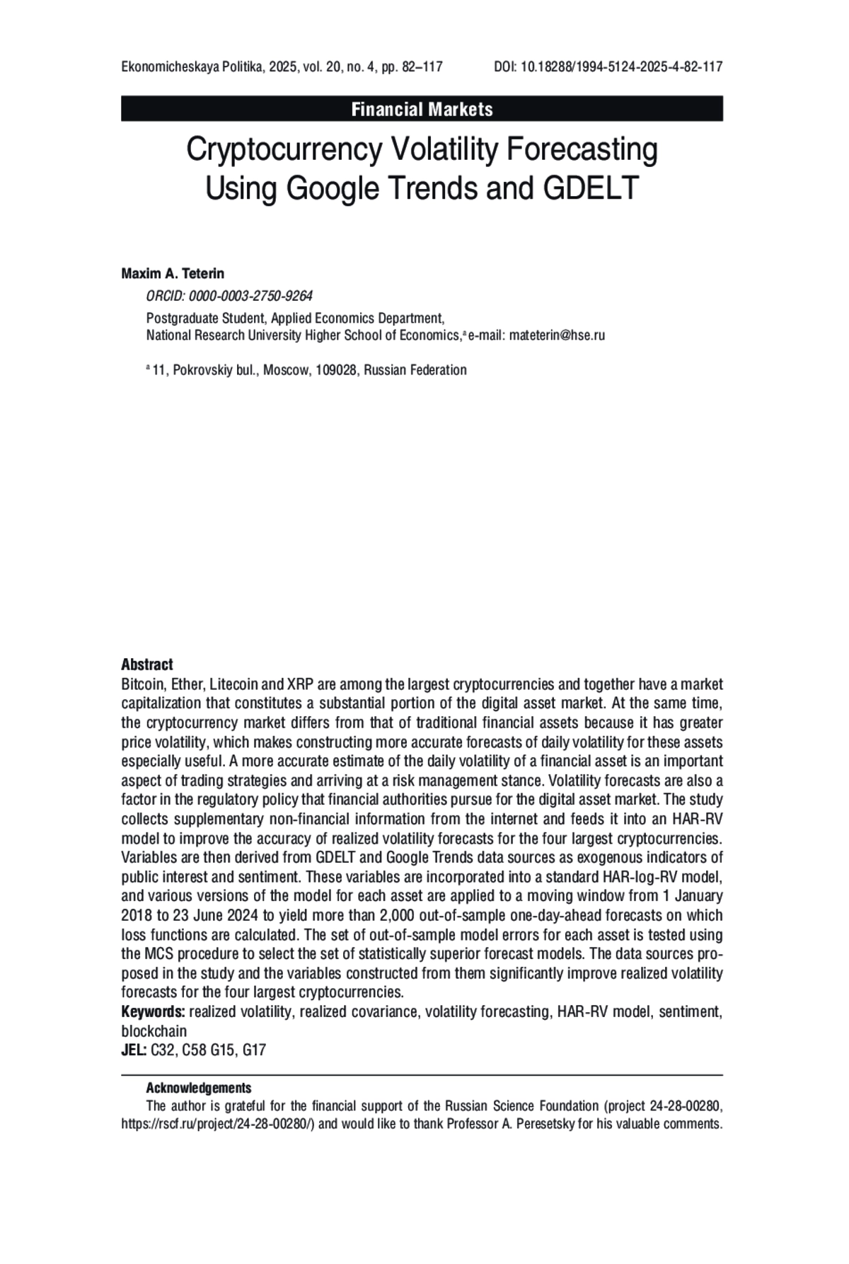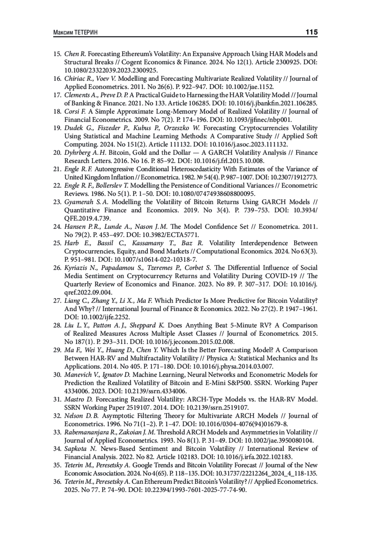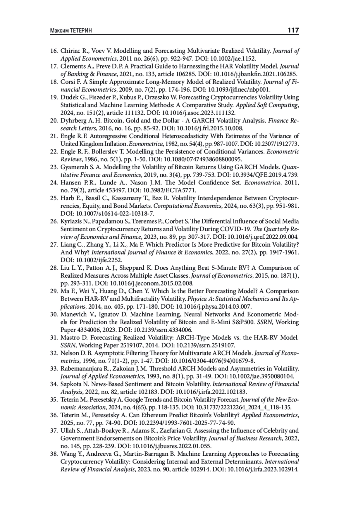 36. Teterin M., Peresetsky A. Can Ethereum Predict Bitcoin’s Volatility? // Applied Econometrics. 2025. No 77. P. 74-90. https://doi.org/10.22394/1993-7601-2025-77-74-90.