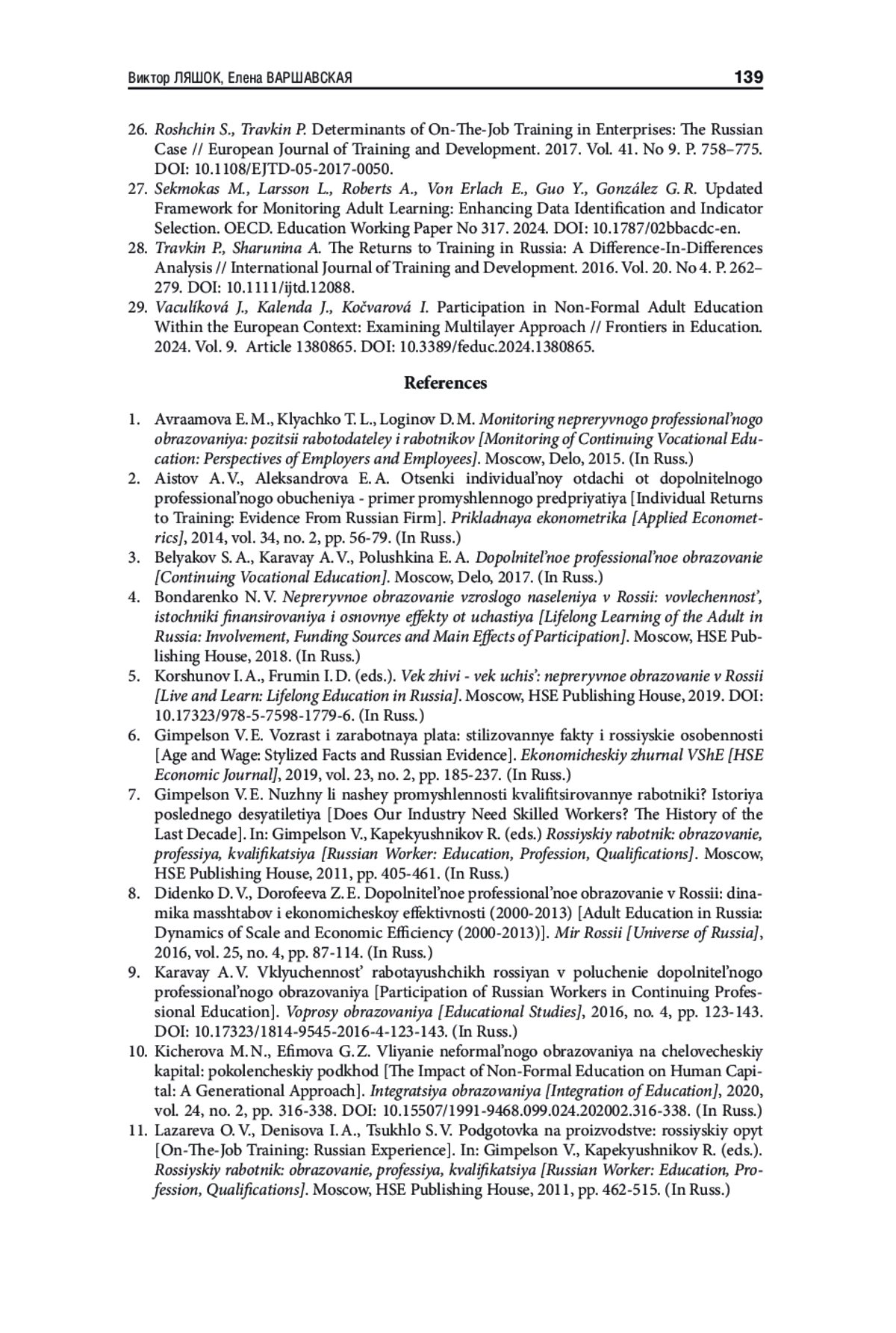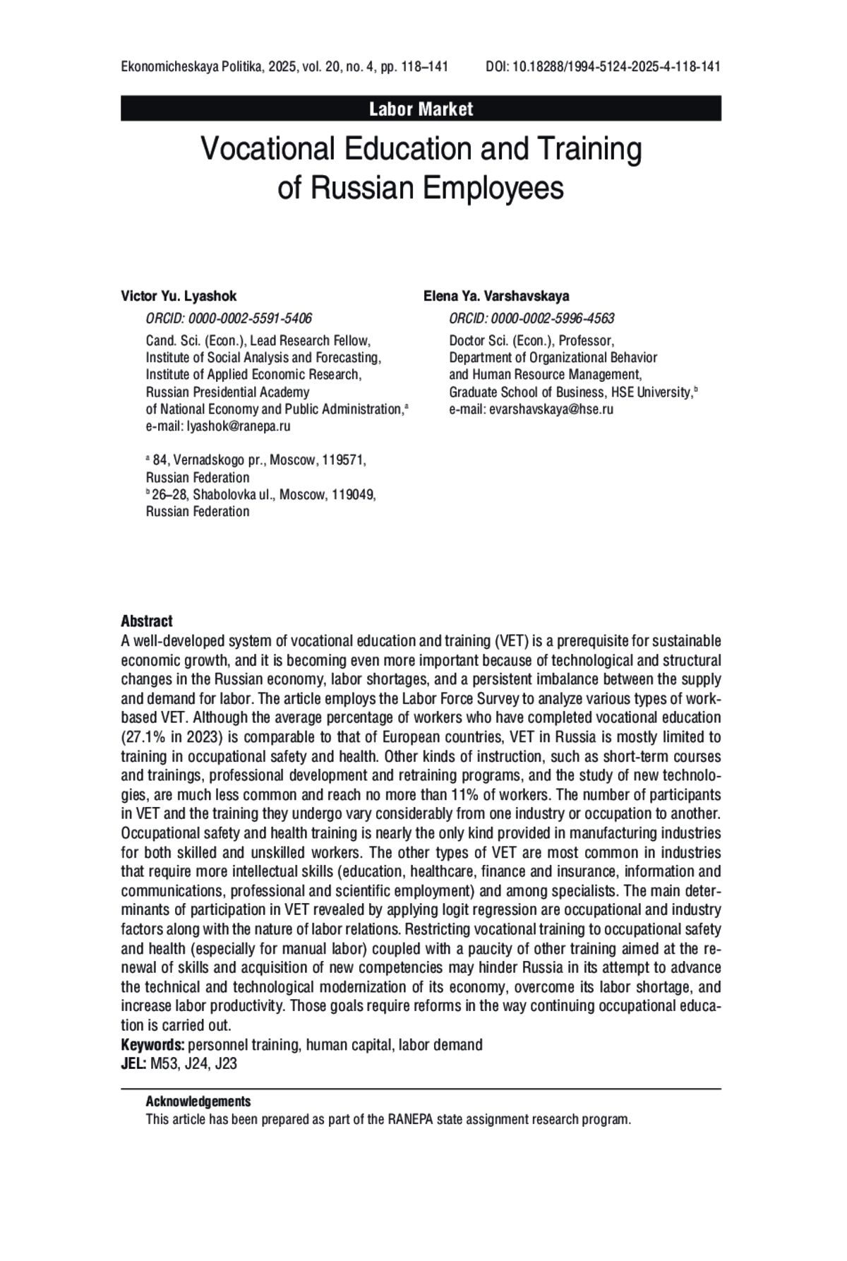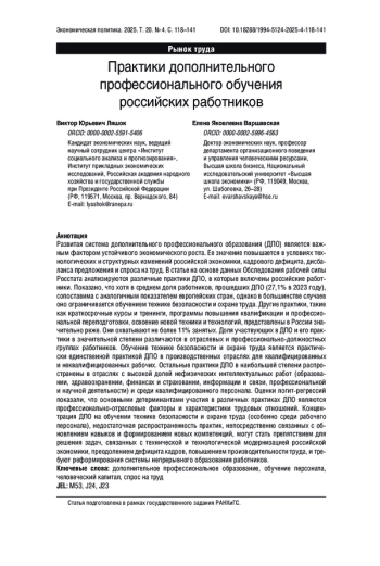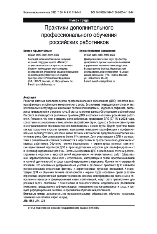 ЛЯШОК В. Ю., ВАРШАВСКАЯ Е. Я. ПРАКТИКИ ДОПОЛНИТЕЛЬНОГО ПРОФЕССИОНАЛЬНОГО ОБУЧЕНИЯ РОССИЙСКИХ РАБОТНИКОВ // ЭКОНОМИЧЕСКАЯ ПОЛИТИКА. 2025. ТОМ 20, № 4