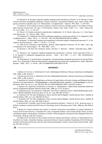 17. Малева Э. М. Создание кобно-медицинской экспертизы в России: Устав воинский (1716 г.) / Э. М. Малева // Сибирский юридический вестник. - 2022. - № 2 (97). - С. 3-8. -. DOI: 10.26516/2071-8136.2022.2.3 EDN: LPSOHN