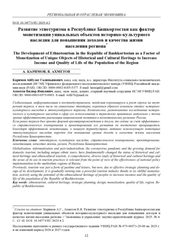 КАРИМОВ А. Г., АХМЕТОВ В. Я. РАЗВИТИЕ ЭТНОТУРИЗМА В РЕСПУБЛИКЕ БАШКОРТОСТАН КАК ФАКТОР МОНЕТИЗАЦИИ УНИКАЛЬНЫХ ОБЪЕКТОВ ИСТОРИКО-КУЛЬТУРНОГО НАСЛЕДИЯ ДЛЯ ПОВЫШЕНИЯ ДОХОДОВ И КАЧЕСТВА ЖИЗНИ НАСЕЛЕНИЯ РЕГИОНА // ЭКОНОМИКА И УПРАВЛЕНИЕ: НАУЧНО-ПРАКТИЧЕСКИЙ ЖУРНАЛ. 2025. № 4 (184)