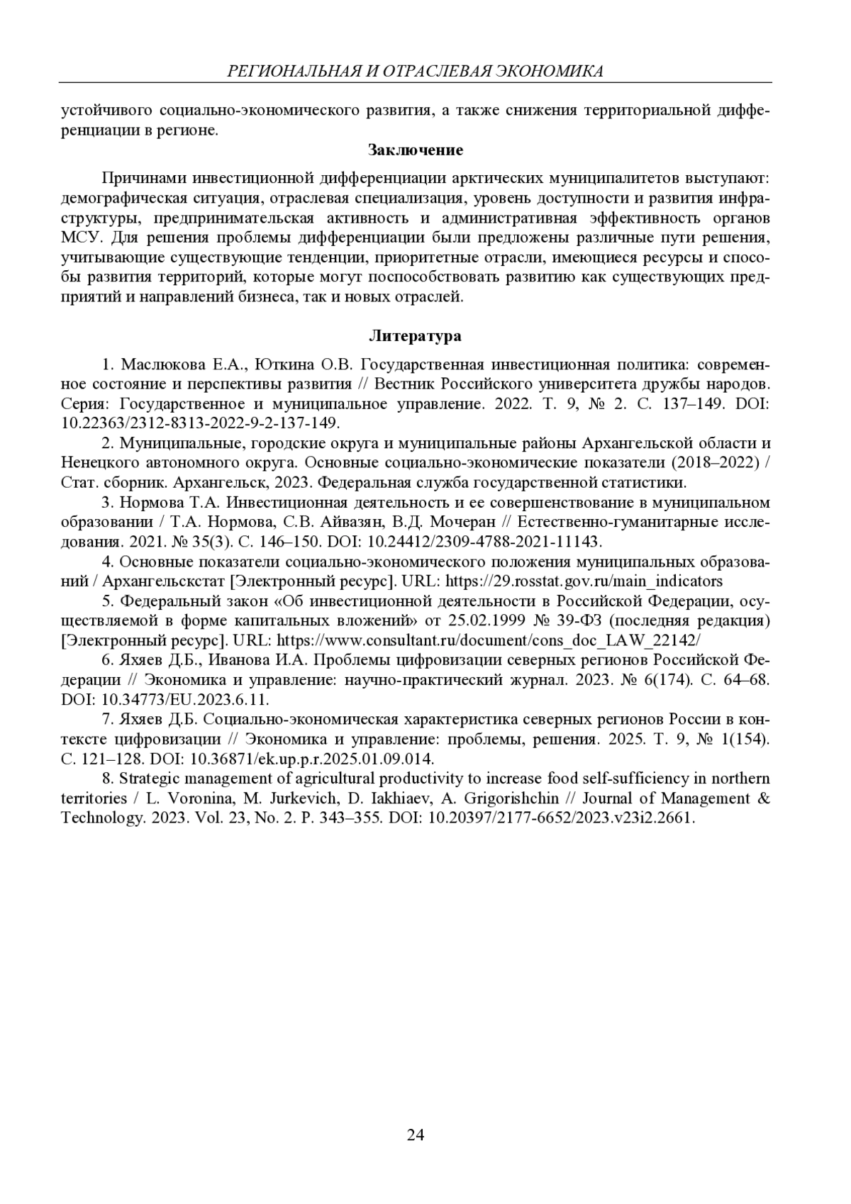 7. Яхяев Д.Б. Социально-экономическая характеристика северных регионов России в контексте цифровизации // Экономика и управление: проблемы, решения. 2025. Т. 9, № 1(154). С. 121-128. DOI: 10.36871/ek.up.p.r.2025.01.09.014 EDN: GSRLRS