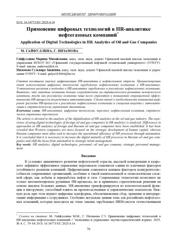 Статья посвящена анализу цифровизации HR-аналитики в нефтегазовой отрасли. Проанализирован опыт использования цифровых технологий зарубежных нефтегазовых компаниях в НR-аналитике. Установлены различия в подходах в HR-аналитике зарубежных и российских нефтегазовых компаниях. Выявлено, что западные компании больше сосредоточены на стратегическом развитии человеческого капитала, тогда как российские компании чаще всего стремятся к повышению операционной эффективности HR-процессов посредством автоматизации. Сделан вывод о необходимости повышения цифровой зрелости HR-процессов в российских нефтегазовых компаниях и смещения акцента с автоматизации к стратегическому управлению талантами