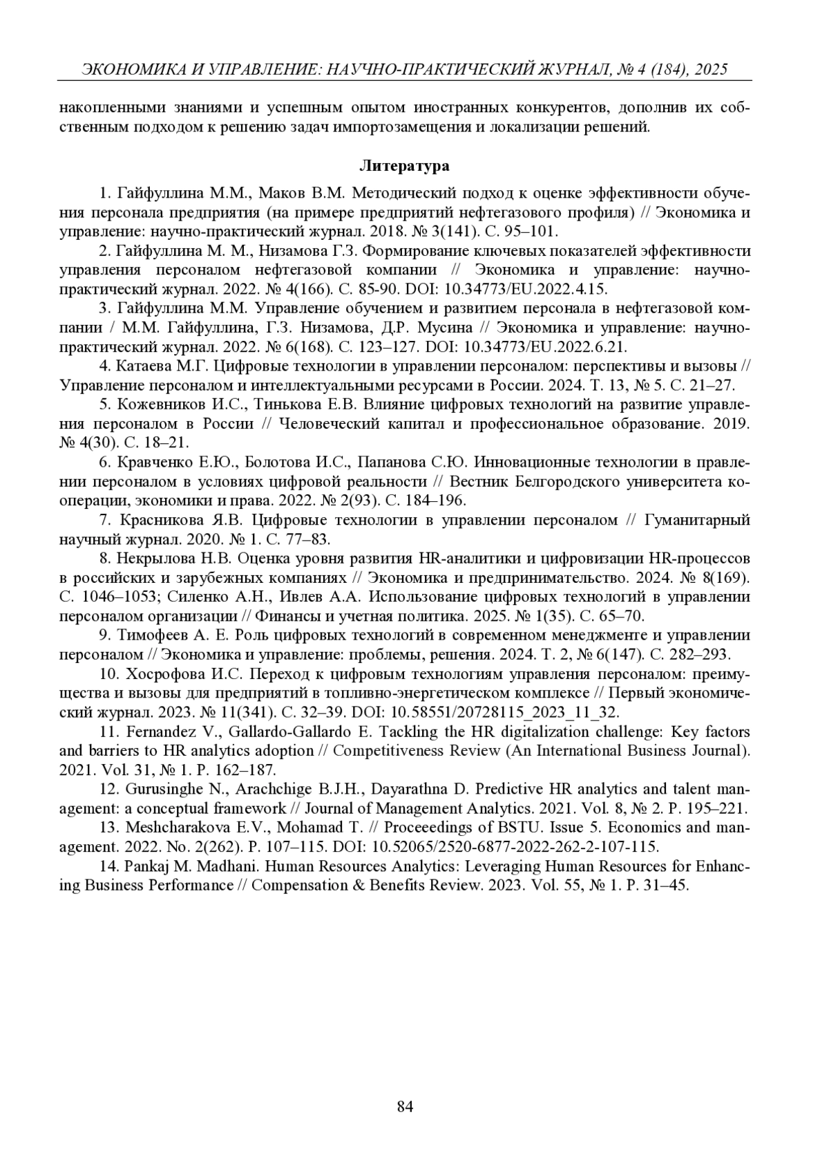 3. Гайфуллина М.М. Управление обучением и развитием персонала в нефтегазовой компании / М.М. Гайфуллина, Г.З. Низамова, Д.Р. Мусина // Экономика и управление: научно-практический журнал. 2022. № 6(168). С. 123-127. DOI: 10.34773/EU.2022.6.21