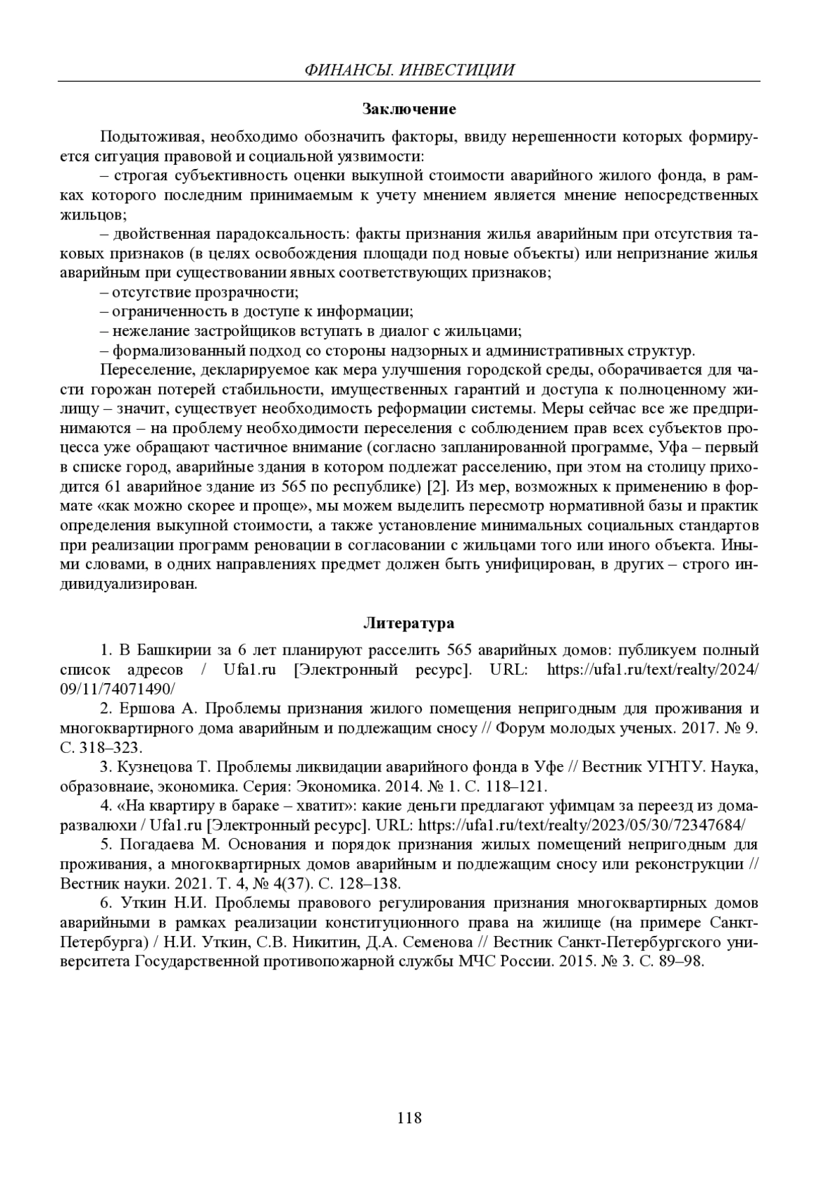 3. Кузнецова Т. Проблемы ликвидации аварийного фонда в Уфе // Вестник УГНТУ. Наука, образовнаие, экономика. Серия: Экономика. 2014. № 1. С. 118-121.