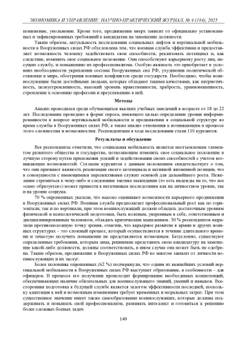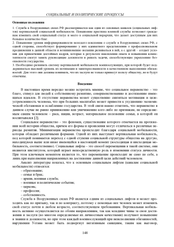 Исследование актуально в связи с необходимостью изучения состояния социальной мобильности лиц, проходящих службу в Вооруженных силах РФ. Проблема заключается в определении уровня информированности молодого поколения в данном вопросе и анализе отношения к возникающим в процессе этого сложностями и возможностями. Цель – определить особенности социальных лифтов и вертикальной мобильности в Вооруженных силах РФ. Методы исследования: анализ научной литературы и опрос. Результаты показали, что Вооруженные силы РФ предоставляют широкий спектр возможностей гражданам для осуществления восходящей вертикальной мобильности. Основные выводы: на высоких должностях должны находиться достойные лица, которые смогут обеспечить слаженную и оперативную деятельность всего кадрового состава в мирное и в военное время