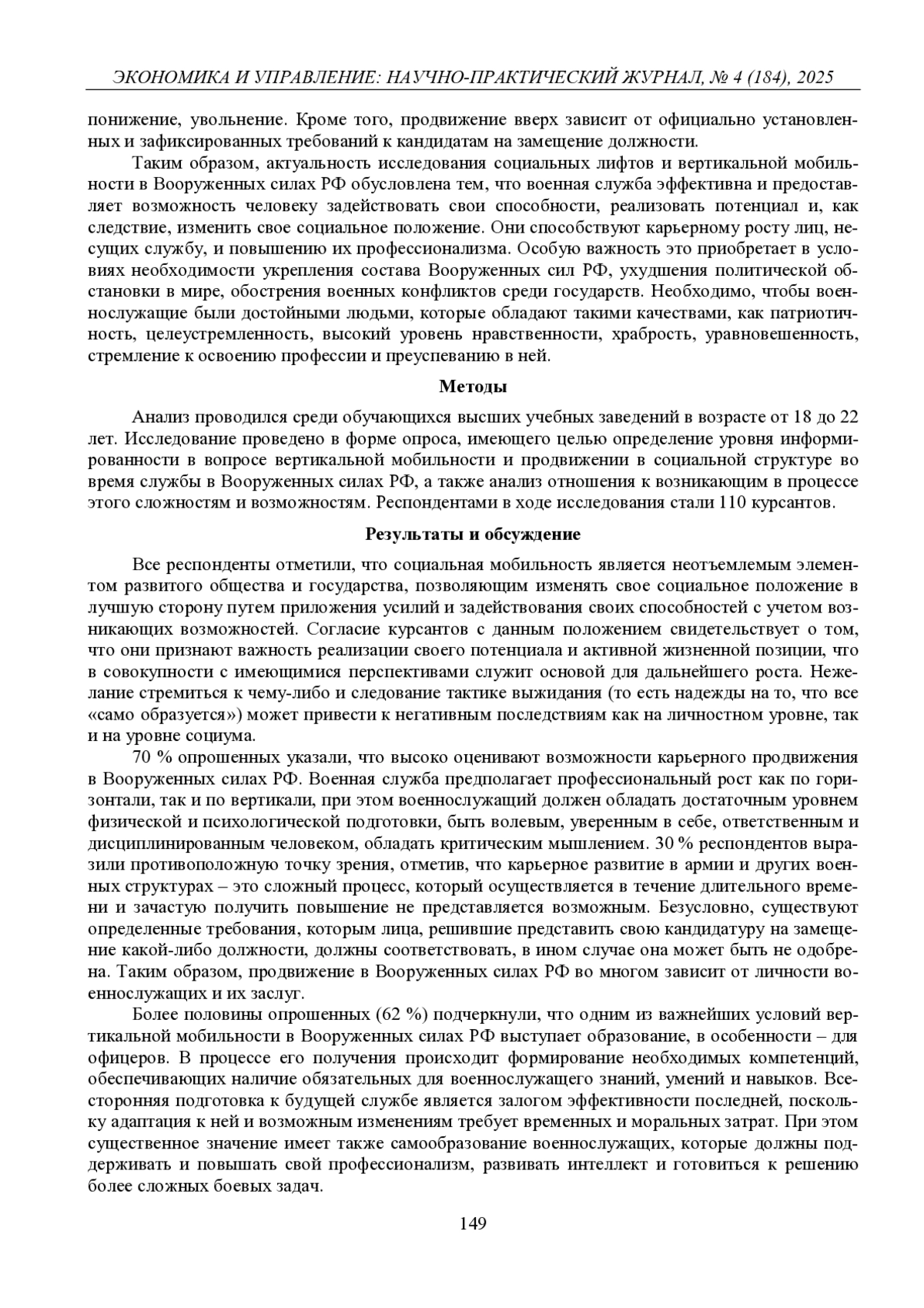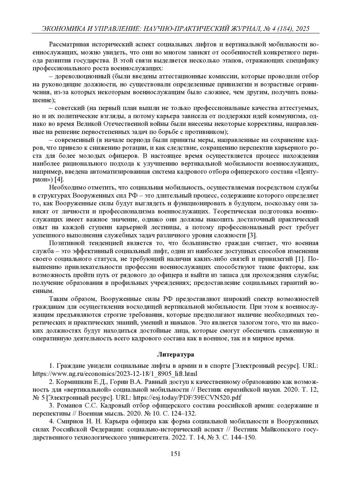 4. Смирнов Н. Н. Карьера офицера как форма социальной мобильности в Вооруженных силах Российской Федерации: социально-исторический аспект // Вестник Майкопского государственного технологического университета. 2022. Т. 14, № 3. С. 144-150. EDN: TIGEXD