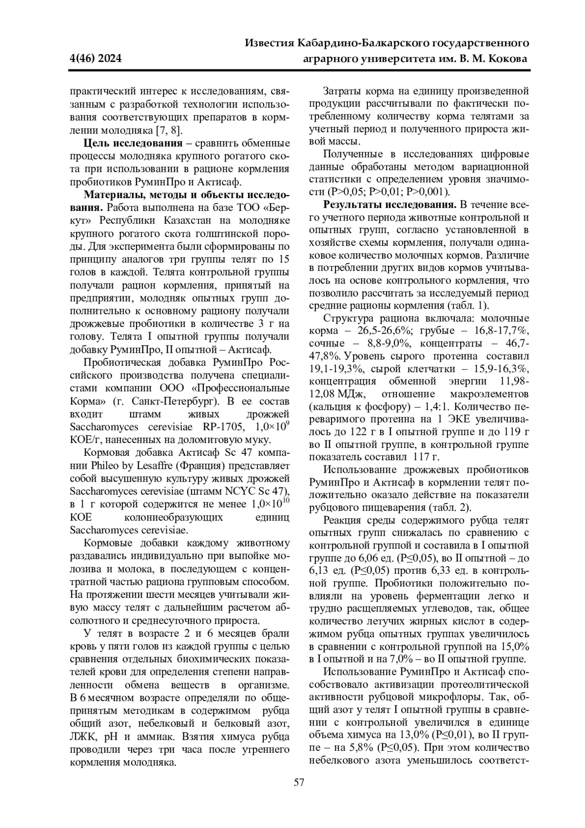 Работа выполнена на базе ТОО «Беркут» Республики Казахстан на молодняке крупного рогатого скота с целью сравнительной оценки обменных процессов в организме телят на фоне применения в рационе кормления пробиотиков РуминПро и Актисаф. Добавка дрожжевых пробиотиков РуминПро и Актисаф в рационе телят молочного периода в дозе 3 г/гол. в сутки показало их положительное влияние на уровень ферментативной активности микробиома рубца в его ферментации легко и трудно расщепляемых углеводов, а также протеолитической активности. При этом РуминПро обеспечил повышение в химусе рубца общего белка на 13%, в том числе белкового азота - на 20,1%, а ЛЖК - на 15%, в то время как с Актисафом различие составило 5,8%, 9,1 и 7,0% соответственно. Снижение уровня аммиака в содержимом рубца в группе с добавкой РуминПро на 14,8% показало его большее поступление в печень для синтеза белка, в группе с Актисаф - различие составило только 6,9%. За период выращивания в организме телят с добавкой РуминПро отмечена более высокая белковосинтезирующуя функция печени и повышение содержания общего белка в крови от 0,6 до 5,6%, оптимизация отношения альбумина к глобулину (1,3). Пробиотики в обеих группах телят повысили щелочной резерв крови, уровень каротина в крови и не оказали отрицательного влияния на минеральный обмен кальция, фосфора и магния. Добавка РуминПро увеличила живую массу телят к шестимесячному возрасту на 4,9%, Актисаф - на 1,7%. Среднесуточный прирост молодняка с использованием РуминПро превосходил контрольную группу на 5,76% (Р≤0,001), с Актисаф - на 1,71% (Р≤0,001), что позволило повысить рентабельность производства живой массы телят молочного периода выращивания на 2,7% и на 0,5% соответственно.