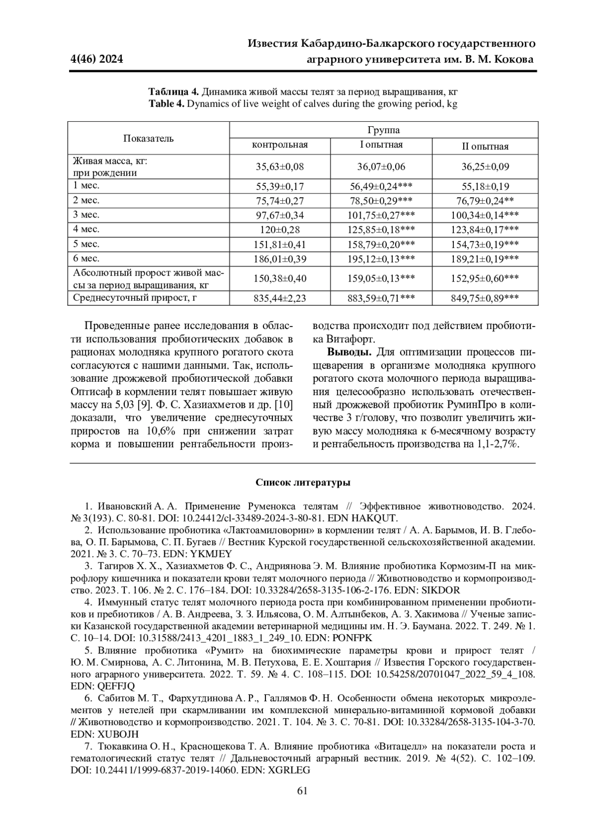 7. 	Тюкавкина О. Н., Краснощекова Т. А. Влияние пробиотика “Витацелл” на показатели роста и гематологический статус телят // Дальневосточный аграрный вестник. 2019. № 4(52). С. 102-109. DOI: 10.24411/1999-6837-2019-14060 EDN: XGRLEG
