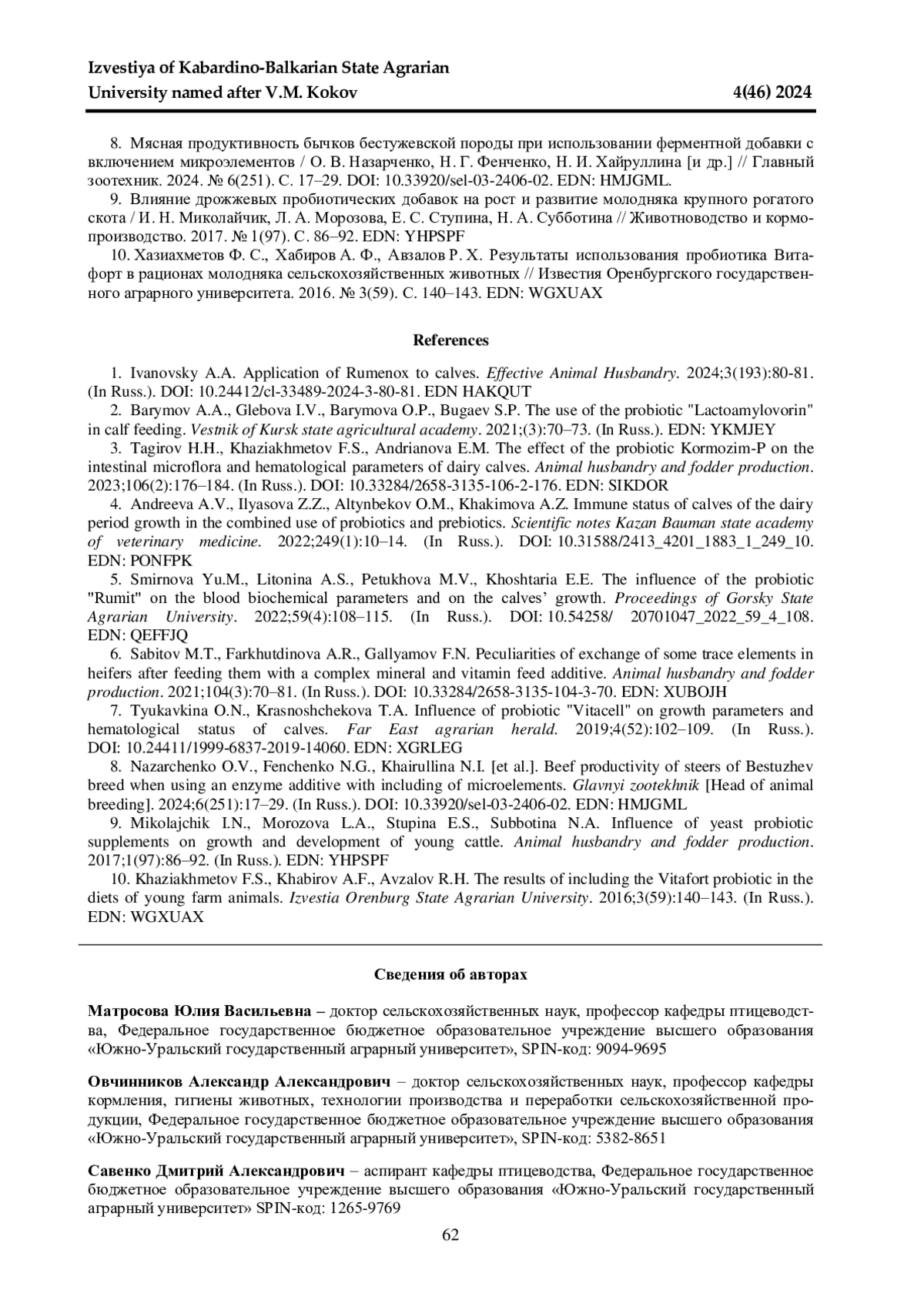 10. 	Хазиахметов Ф. С., Хабиров А. Ф., Авзалов Р. Х. Результаты использования пробиотика Витафорт в рационах молодняка сельскохозяйственных животных // Известия Оренбургского государственного аграрного университета. 2016. № 3(59). С. 140-143. EDN: WGXUAX