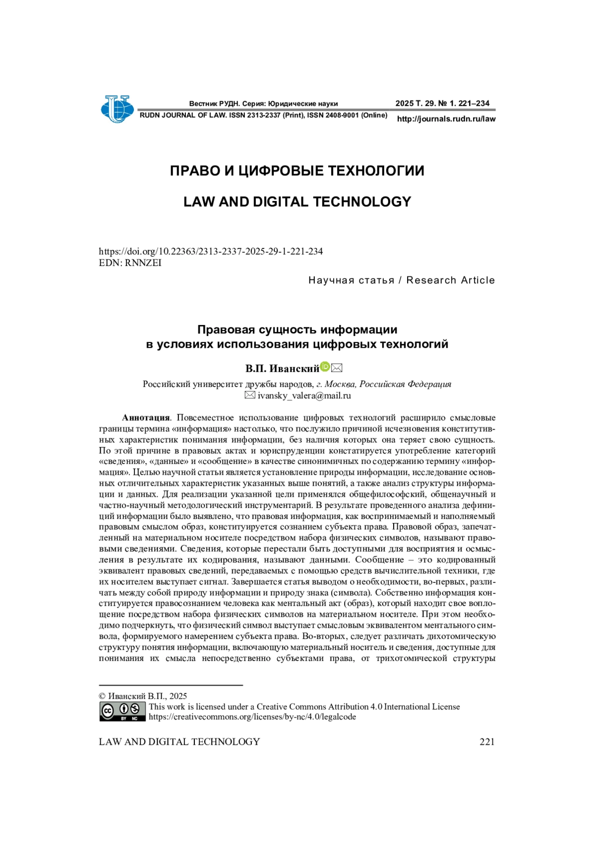Обоснование темы статьи определяется ее актуальностью и формулированием научно-правовых проблем. В качестве общего узлового момента проблемного поля выступает наклеивание цифрового ярлыка на все информационные процессы без надлежащего научного осмысления, что создает условия для возникновения юридических коллизий не только на законодательном уровне, но и в правоприменительной практике.