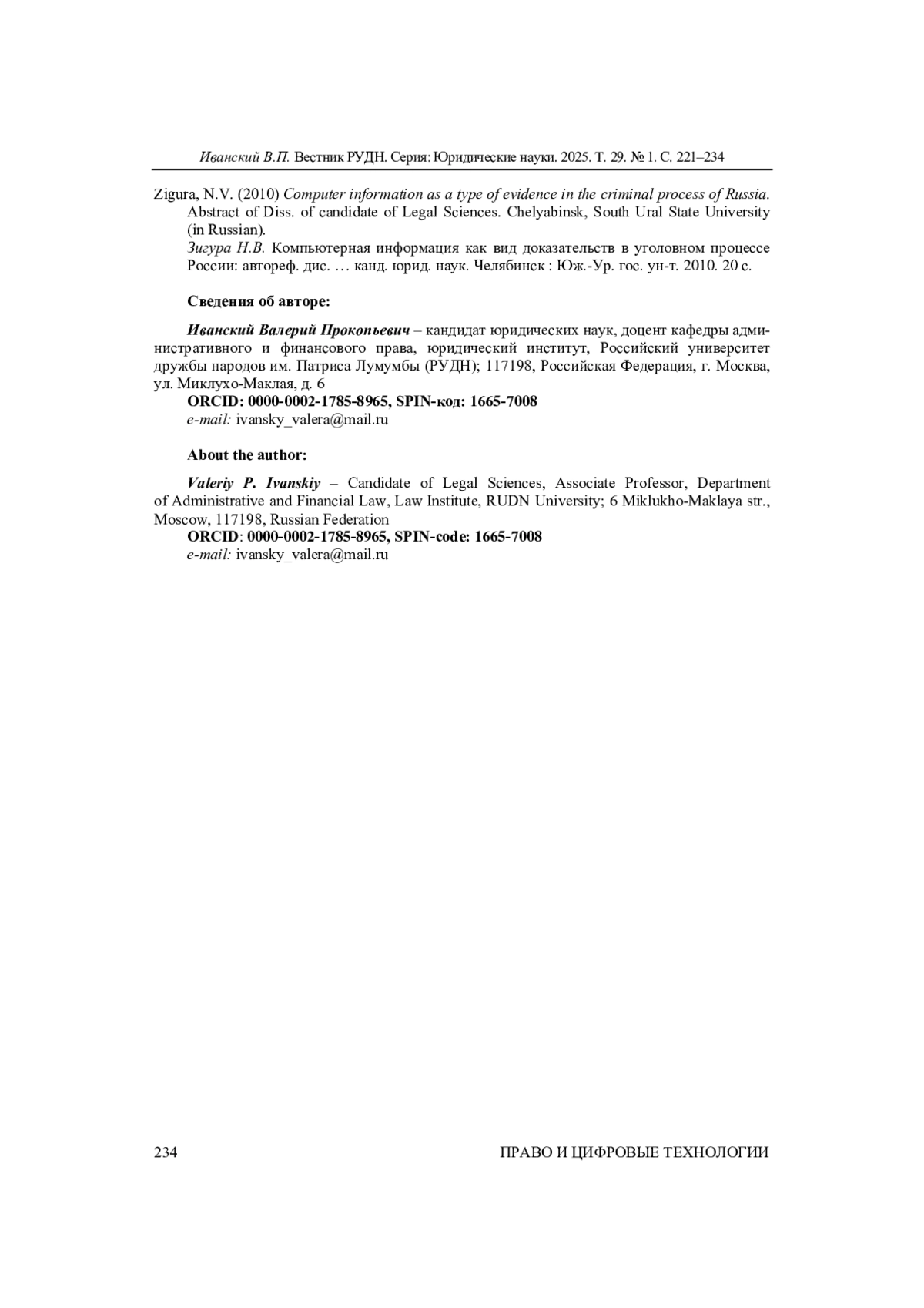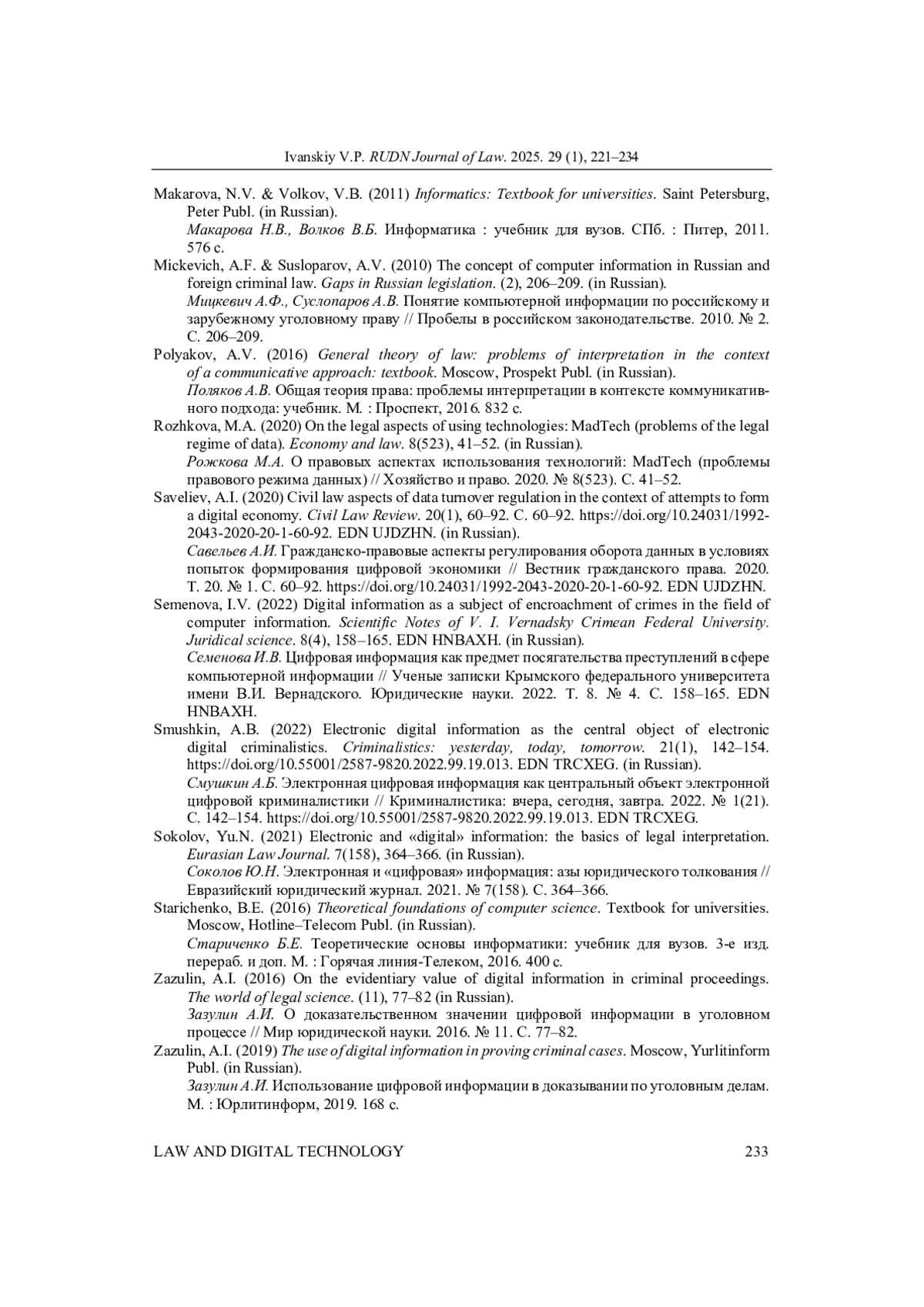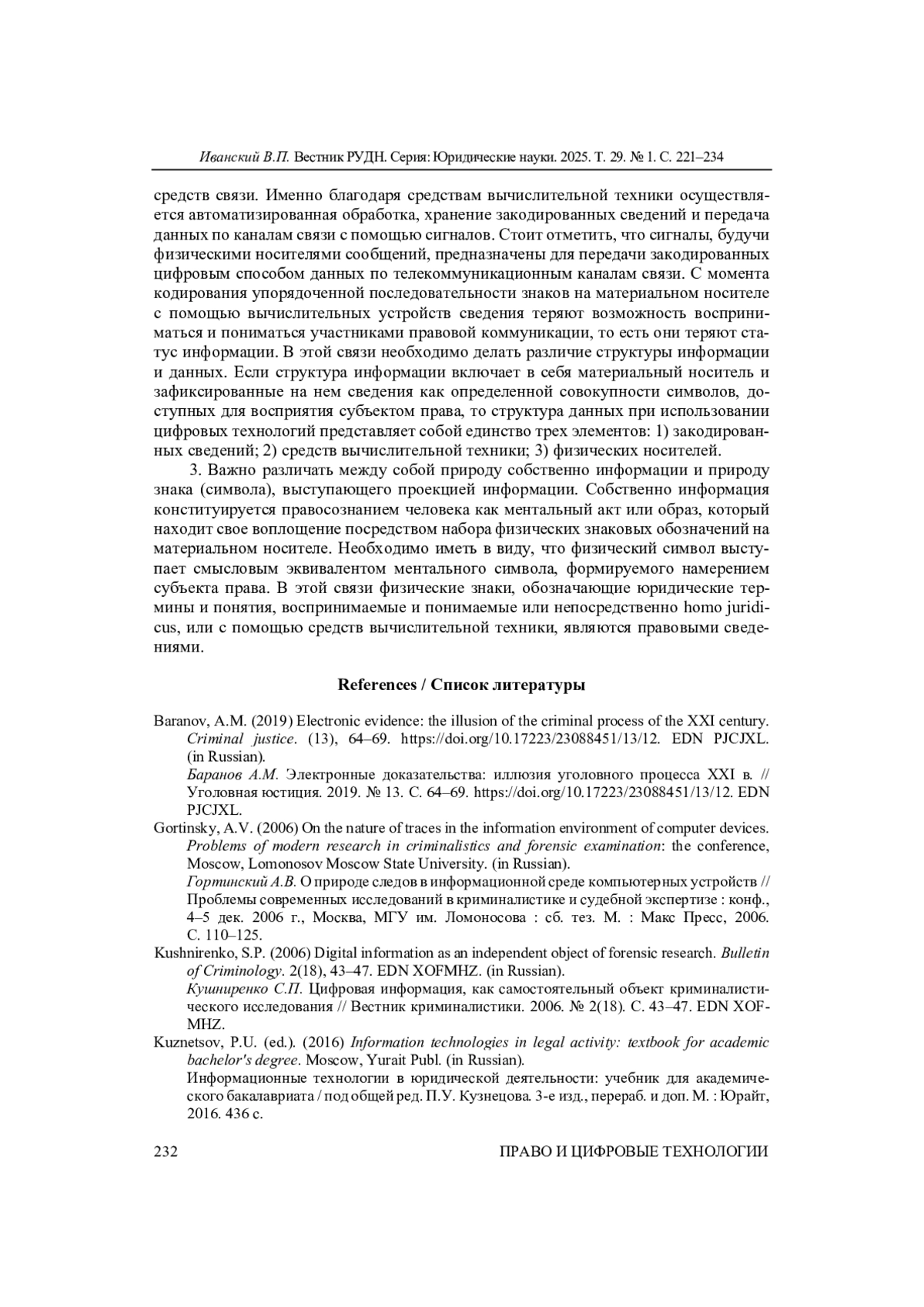 1. Баранов А.М. Электронные доказательства: иллюзия уголовного процесса ХХI в. // Уголовная юстиция. 2019. № 13. С. 64-69. DOI: 10.17223/23088451/13/12 EDN: PJCJXL