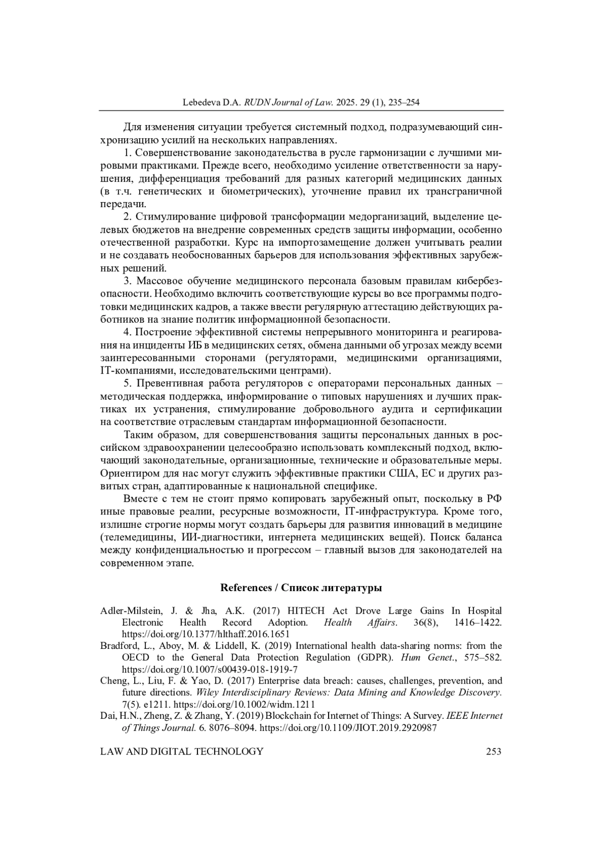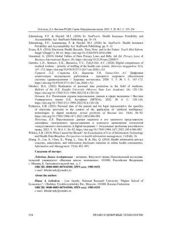 11. Подузова, Е.Б. Персональные данные пациента и его законного представителя: специфика электронного предоставления в контексте применения технологий “искусственного интеллекта” в digital-медицине // Актуальные проблемы российского права. 2023. Т. 18. № 4. C. 86-92. DOI: 10.17803/1994-1471.2023.149.4.086-092 EDN: FFJYNU