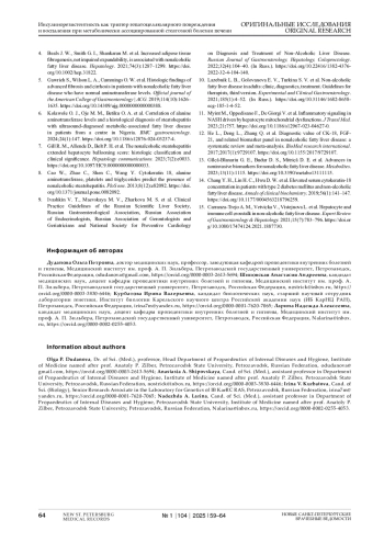 6. Kolawole O. J., Oje M. M., Betiku O. A. et al. Correlation of alanine aminotransferase levels and a histological diagnosis of steatohepatitis with ultrasound-diagnosed metabolic-associated fatty liver disease in patients from a centre in Nigeria // BMC gastroenterology. 2024. Vol. 24, № 1. P. 147. DOI: 10.1186/s12876-024-03237-4