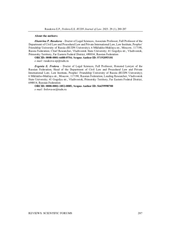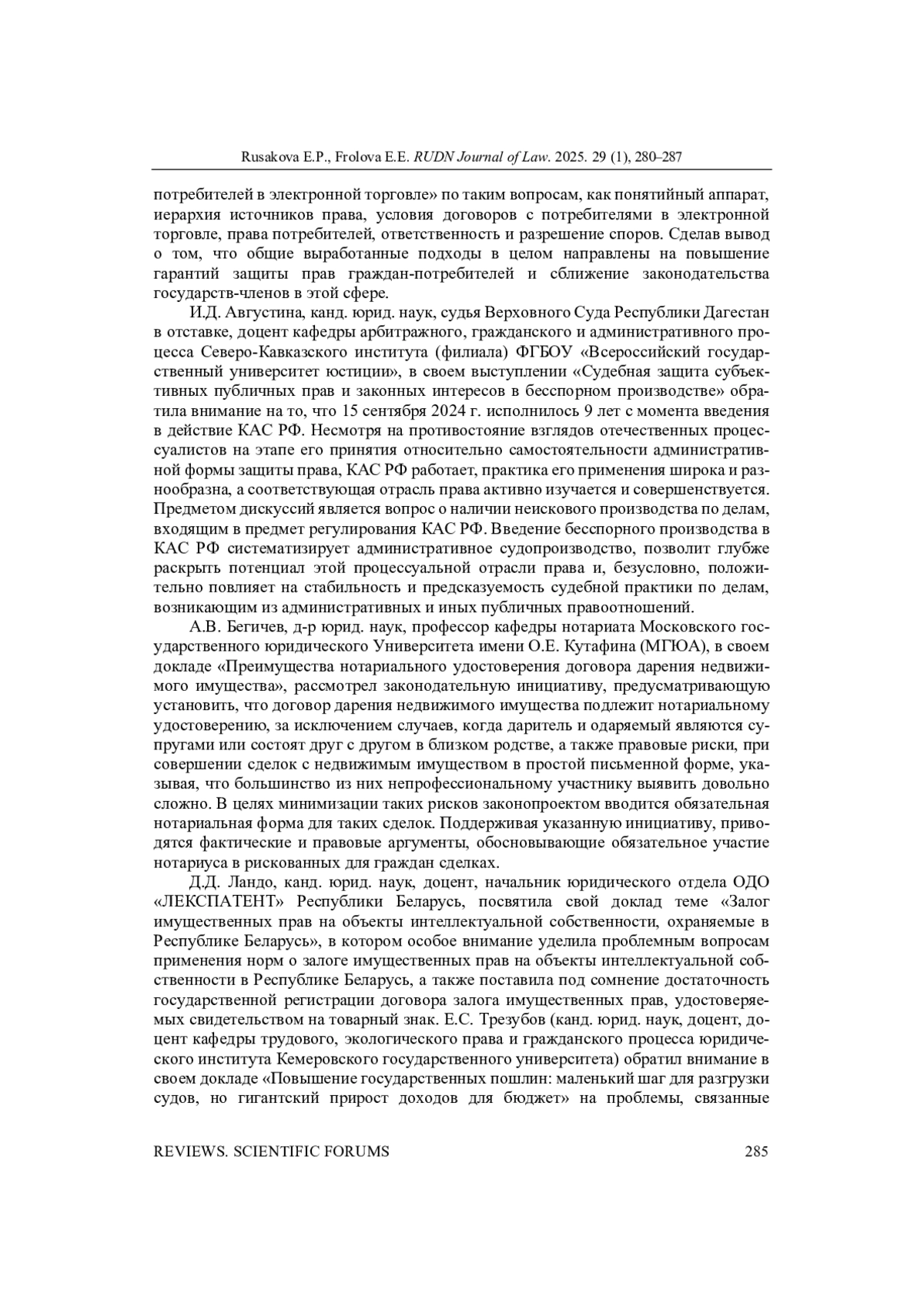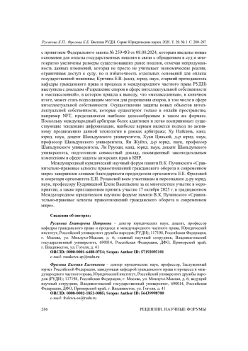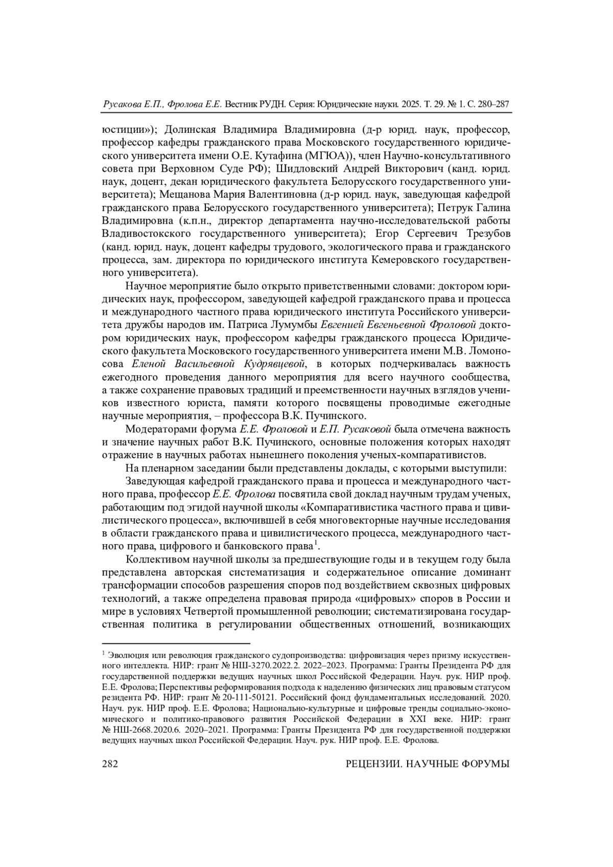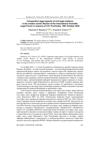 РУСАКОВА Е. П., ФРОЛОВА Е. Е. СРАВНИТЕЛЬНО-ПРАВОВЫЕ АСПЕКТЫ ПРАВООТНОШЕНИЙ ГРАЖДАНСКОГО ОБОРОТА В СОВРЕМЕННОМ МИРЕ: ОБЗОР МЕЖДУНАРОДНОГО НАУЧНОГО ЮРИДИЧЕСКОГО ФОРУМА ПАМЯТИ В. К. ПУЧИНСКОГО, 18 ОКТЯБРЯ 2024 Г. // ВЕСТНИК РОССИЙСКОГО УНИВЕРСИТЕТА ДРУЖБЫ НАРОДОВ. СЕРИЯ: ЮРИДИЧЕСКИЕ НАУКИ. 2025. Т. 29 № 1