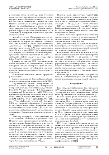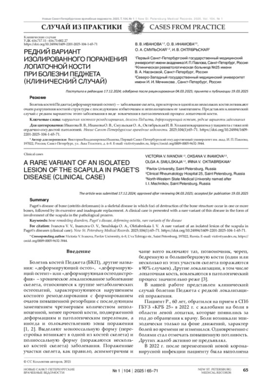 ИВАНОВА В. В., ИНАМОВА О. В., СМУЛЬСКАЯ О. А., ОКТЯБРЬСКАЯ И. В. РЕДКИЙ ВАРИАНТ ИЗОЛИРОВАННОГО ПОРАЖЕНИЯ ЛОПАТОЧНОЙ КОСТИ ПРИ БОЛЕЗНИ ПЕДЖЕТА (КЛИНИЧЕСКИЙ СЛУЧАЙ) // НОВЫЕ САНКТ-ПЕТЕРБУРГСКИЕ ВРАЧЕБНЫЕ ВЕДОМОСТИ. 2025. № 1, ТОМ 104
