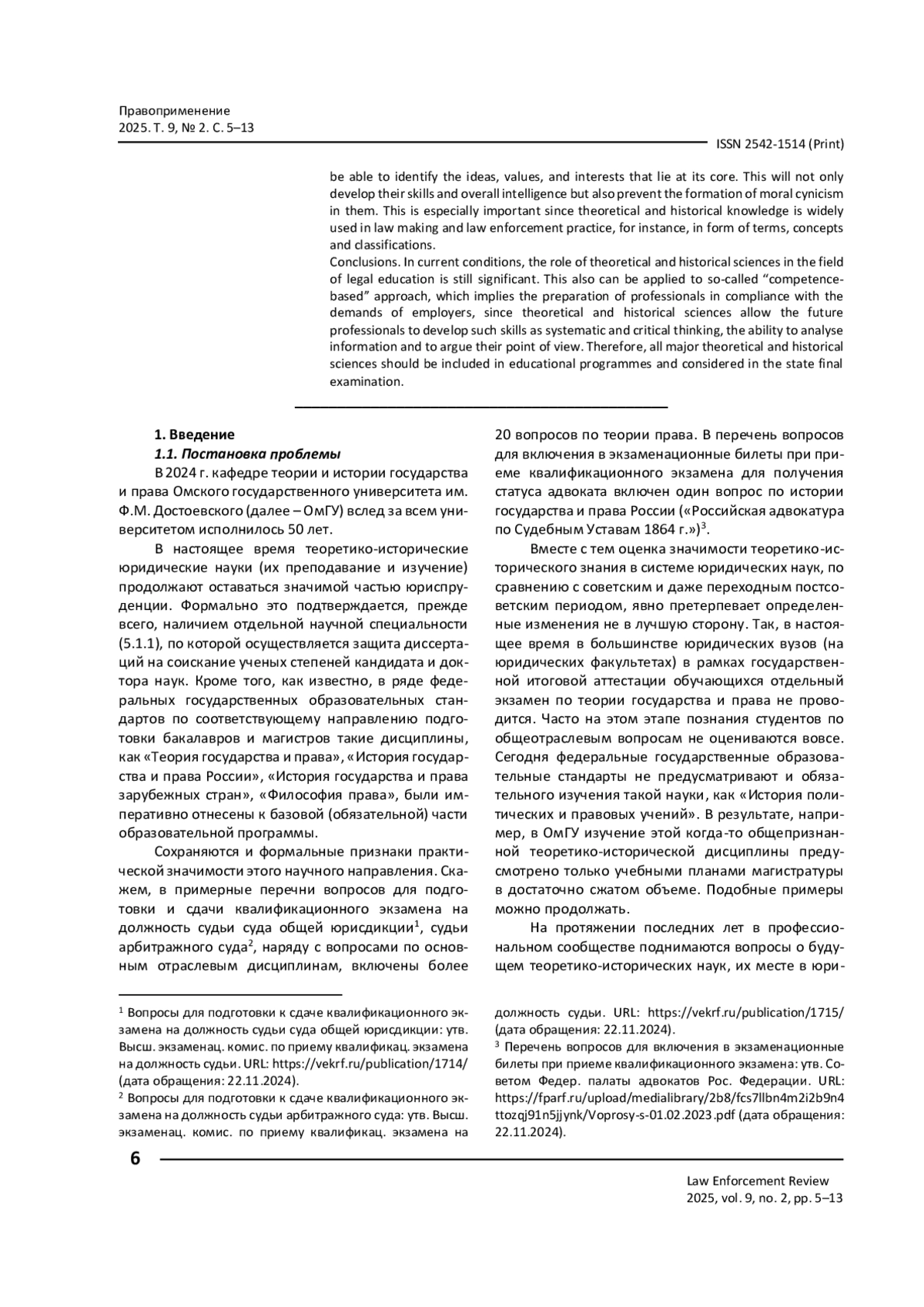 Рассматривается вопрос о современном значении теоретико-исторических наук. Доказывается, что данные науки продолжают оставаться незаменимыми для развития правовых идей, правовых ценностей, общеправовой догматики, выполняют определенную роль в качестве основания правотворческой и правоприменительной практики, а реализуемый в высшем образовании компетентностный подход не должен приводить к редукции теоретико-исторического знания. В то же время оценка современных исследований в области данных наук на предмет их актуальности и научной новизны зависит от того, насколько эти исследования действительно способствуют практическому развитию правовых идей (правовых ценностей) и общеправовой догматики.