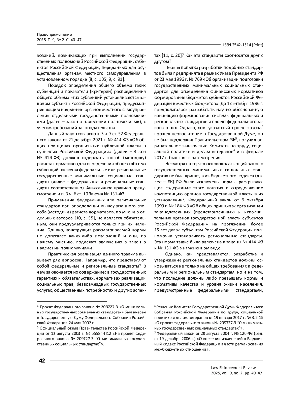 Применение федеральных или региональных стандартов при определении вышеуказанного способа (методики) расчета нормативов, по мнению отдельных авторов [10, с. 55], не является обязательным, они предусматриваются только при их наличии. Однако, конструкция рассматриваемой нормы не допускает каких-либо исключений и они, по нашему мнению, подлежат включению в закон о наделении полномочиями.