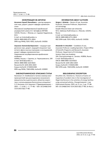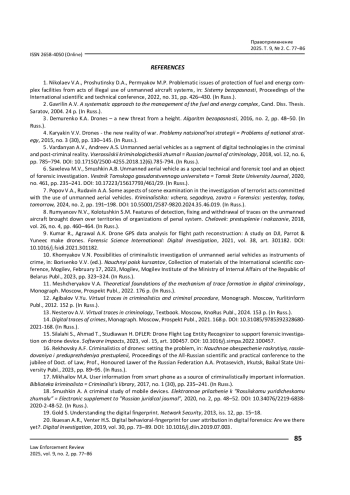 7. Попов В. А. Некоторые аспекты осмотра места происшествия при расследовании террористических актов, совершенных с использованием беспилотных летательных аппаратов / В. А. Попов, А. А. Рудавин // Криминалистика: вчера, сегодня, завтра. - 2024. - № 2. - С. 191-198. - https://doi.org/10.55001/2587-9820.2024.35.46.019.