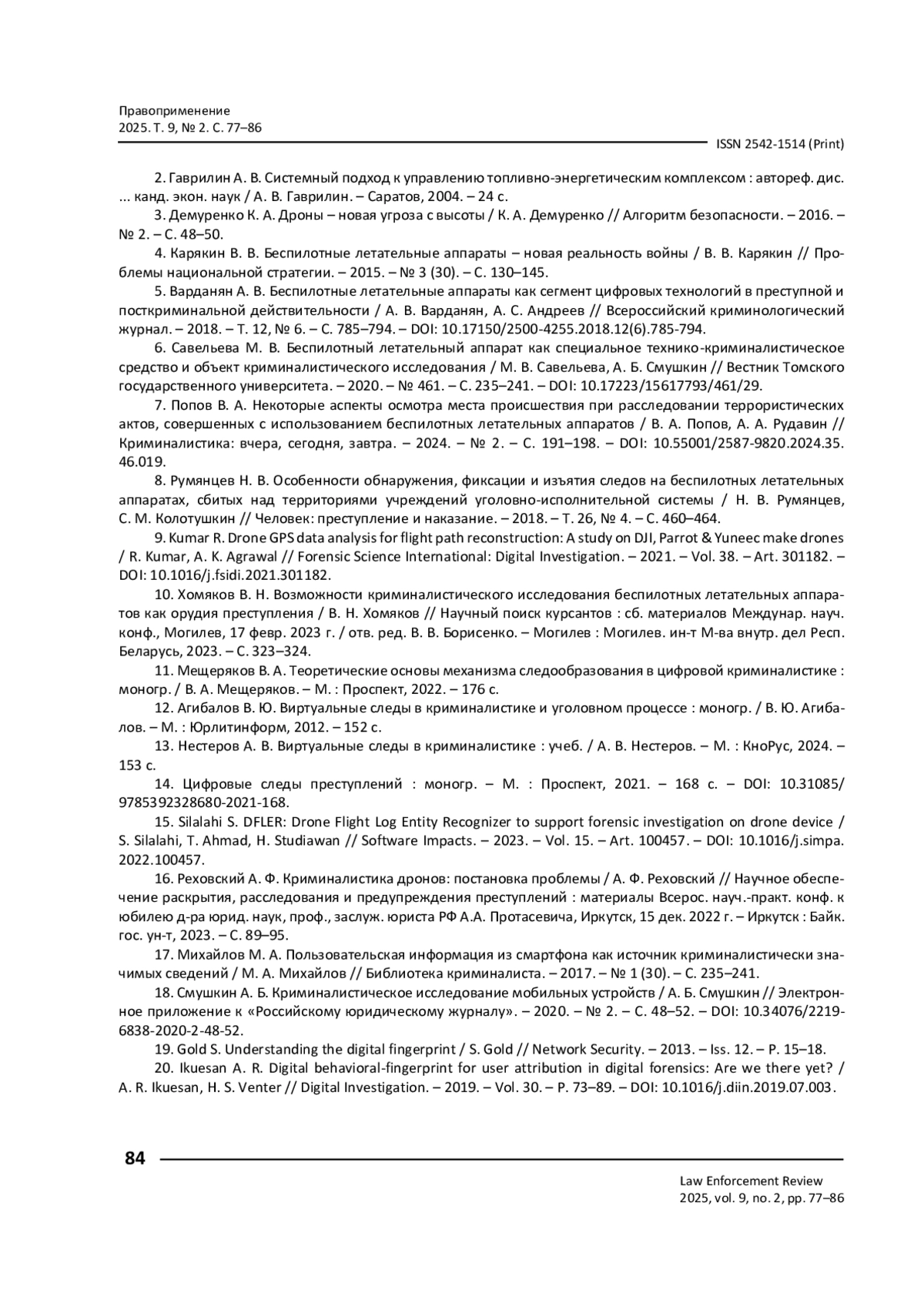 15. Silalahi S. DFLER: Drone Flight Log Entity Recognizer to support forensic investigation on drone device / S. Silalahi, T. Ahmad, H. Studiawan // Software Impacts. - 2023. - Vol. 15. - Art. 100457. - https://doi.org/10.1016/j.simpa. 2022.100457.