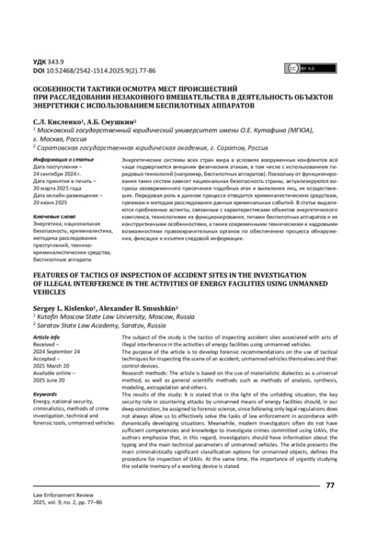 Энергетические системы всех стран мира в условиях вооруженных конфликтов всё чаще подвергаются внешним физическим атакам, в том числе с использованием передовых технологий (например, беспилотных аппаратов). Поскольку от функционирования таких систем зависит национальная безопасность страны, актуализируются вопросы своевременного пресечения подобных атак и выявления лиц, их осуществивших. Передовая роль в данном процессе отводится криминалистическим средствам, приемам и методам расследования данных криминальных событий. В статье выделяются проблемные аспекты, связанные с характеристиками объектов энергетического комплекса, технологиями их функционирования, типами беспилотных аппаратов и их конструктивными особенностями, а также современными техническими и кадровыми возможностями правоохранительных органов по обеспечению процесса обнаружения, фиксации и изъятия следовой информации.