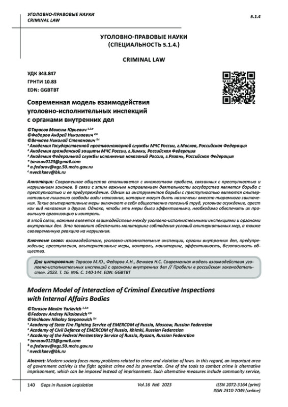 Современное общество сталкивается с множеством проблем, связанных с преступностью и нарушением законов. В связи с этим важным направлением деятельности государства является борьба с преступностью и ее предупреждение. Одним из инструментов борьбы с преступностью являются альтернативные лишению свободы виды наказания, которые могут быть назначены вместо тюремного заключения. Такие альтернативные меры включают в себя общественно полезный труд, условное осуждение, арест как вид наказания и другие. Однако, чтобы эти меры были эффективными, необходимо обеспечить их правильную организацию и контроль. В этой связи, важным является взаимодействие между уголовно-исполнительными инспекциями и органами внутренних дел. Это позволит обеспечить мониторинг соблюдения условий альтернативных мер, а также своевременную реакцию на нарушения.
