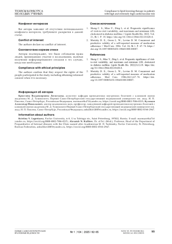ЛЕГОСТАЕВА К. В., КУЛИКОВ А. Н. КОМПЛАЕНС К ГИПОЛИПИДЕМИЧЕСКОЙ ТЕРАПИИ У БОЛЬНЫХ ВЫСОКОГО И КРАЙНЕ ВЫСОКОГО СЕРДЕЧНОСОСУДИСТОГО РИСКА // НОВЫЕ САНКТ-ПЕТЕРБУРГСКИЕ ВРАЧЕБНЫЕ ВЕДОМОСТИ. 2025. № 1, ТОМ 104