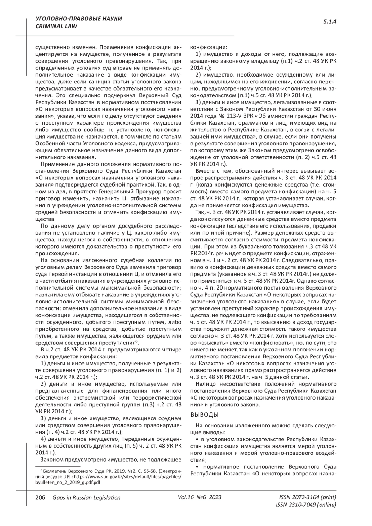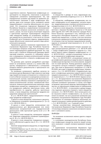 В соответствии с УК РК 2014 г., по общему правилу, конфискация имущества не назначается несовершеннолетним. Изложенное положение УК РК 2014 г. разъяснено Верховным Судом в нормативном постановлении «О некоторых вопросах назначения уголовного наказания» что, в случае, если санкция статьи Особенной части УК РК 2014 г. предусматривает конфискацию имущества как обязательное дополнительное наказание, однако преступление совершено лицом в несовершеннолетнем возрасте, то с учетом положений Общей части УК РК 2014 г. дополнительное наказание в виде конфискации имущества не применяется. В этой связи следует дополнительно отметить, что в нормативном постановлении Верховного Суда Республики Казахстан от 11 апреля 2002 года «О судебной практике по делам об уголовных правонарушениях несовершеннолетних и о вовлечении их в совершение уголовных правонарушений и иных антиобщественных действий» подчеркнуто, что исходя из содержания части первой статьи 81 УК РК 2014 г. к лицам, совершившим уголовное правонарушение в несовершеннолетнем возрасте, не может быть применено дополнительное наказание в виде конфискации имущества.
