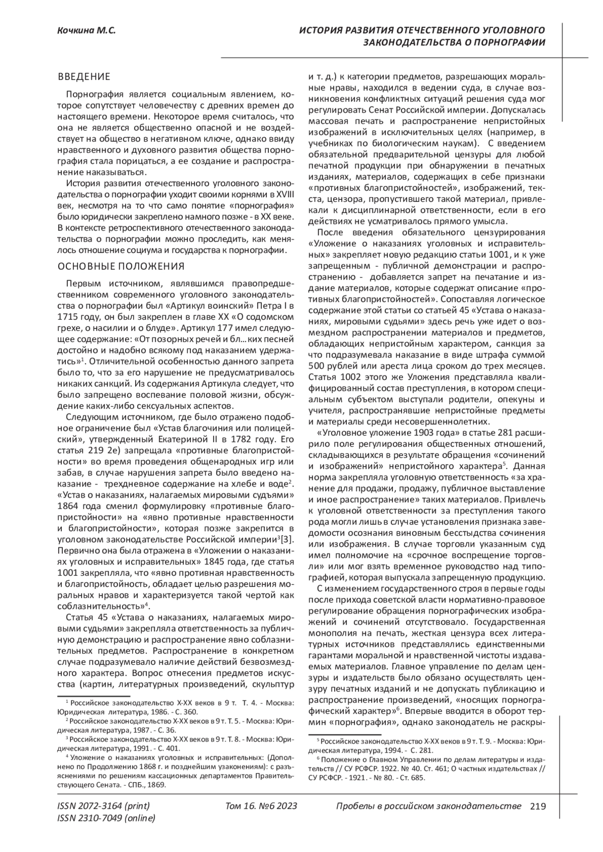 Torosyan R.V. Criminal liability for the illegal production and distribution of pornographic objects in Russian criminal law: historical continuity and evolution // A Russian investigator. 2009. № 24. P. 23-24.