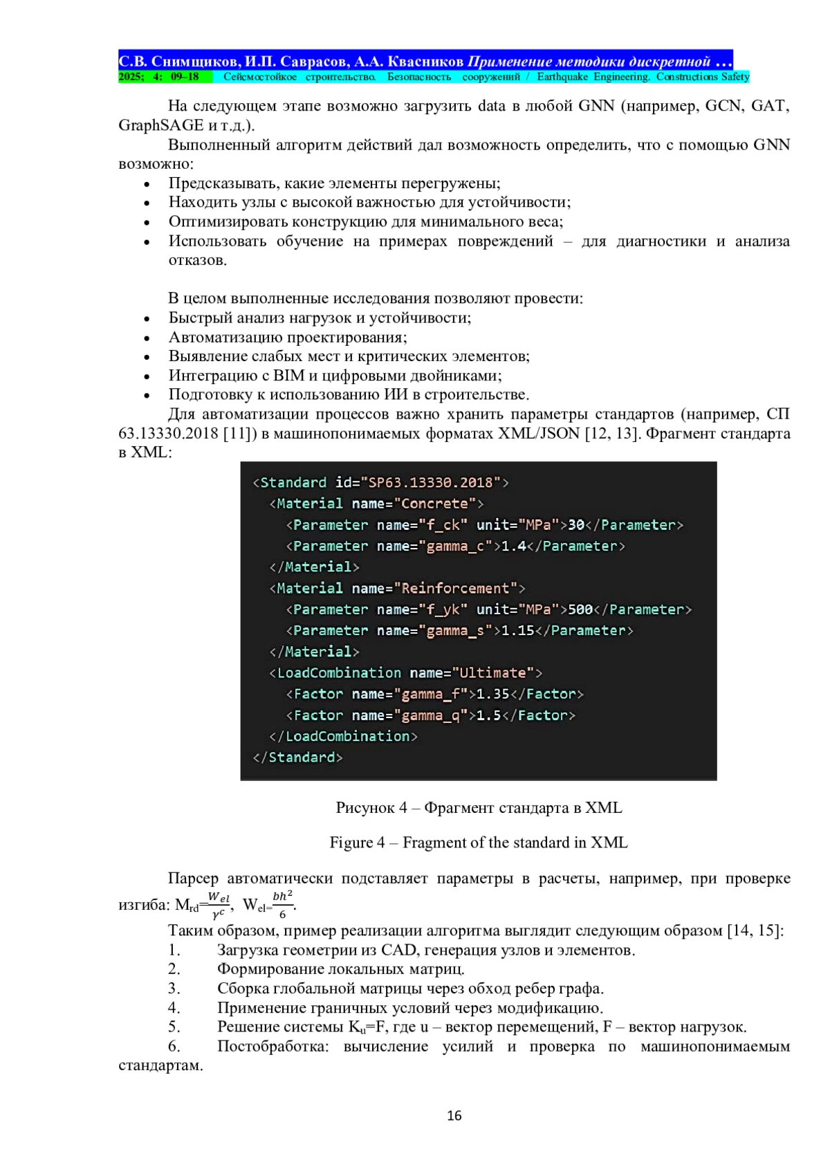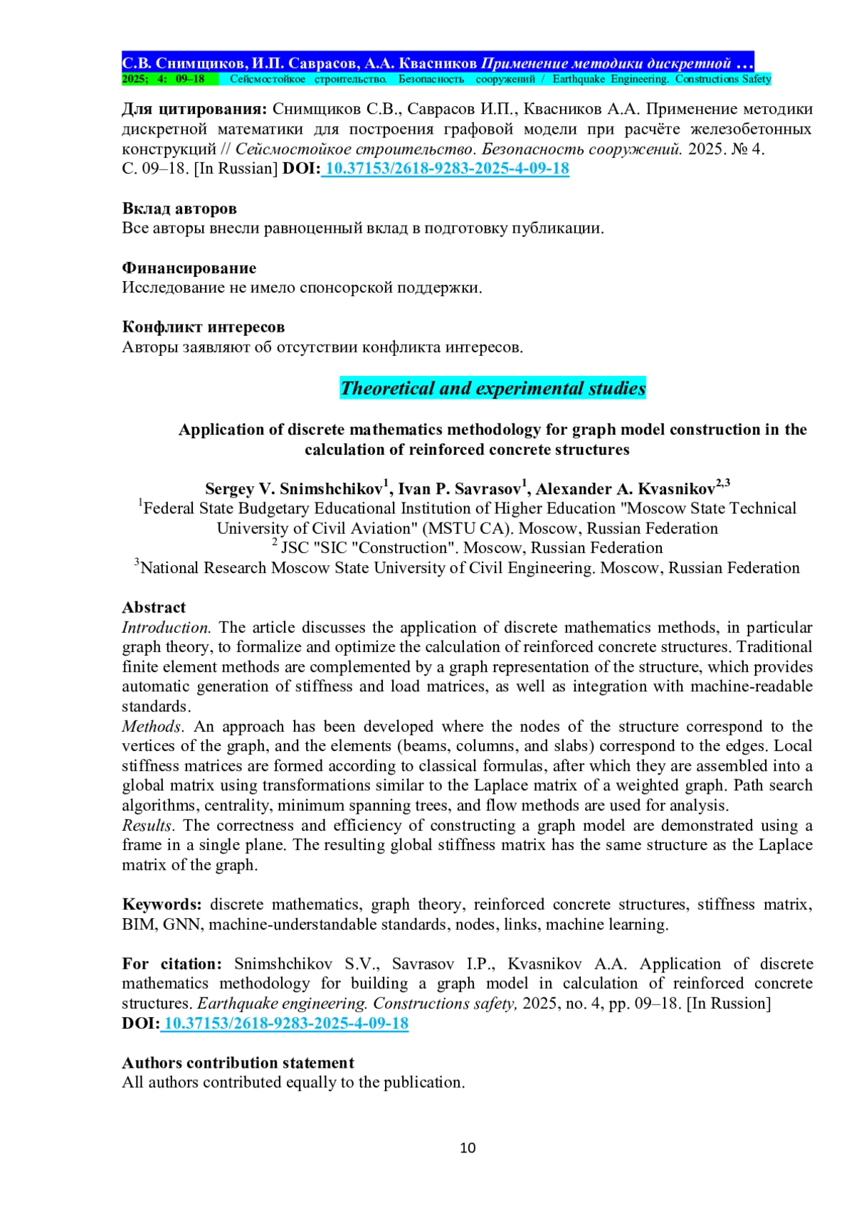 Выводы. Предложен графово-дискретный подход к расчету железобетонных конструкций, обеспечивающий автоматизацию формирования расчетной модели. Структура глобальной матрицы жесткости соответствует матрице Лапласа взвешенного графа. Применение алгоритмов теории графов позволяет анализировать нагрузку, выявлять критические узлы и оптимизировать структуру. Метод совместим с BIM, GNN и машинопонимаемыми стандартами, что облегчает интеграцию в цифровое проектирование.