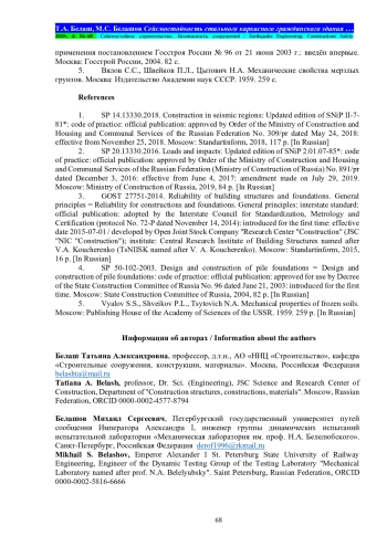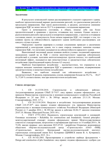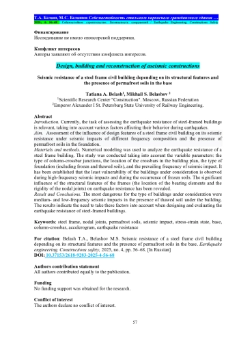 Материалы и методы. Использовано численное моделирование для анализа сейсмостойкости стального каркасного здания. Исследование проведено с учетом варьируемых параметров: тип узловых соединений колонна-ригель, расположение ригелей в плане здания, тип основания (включая твердомерзлые и оттаявшие грунты), и преобладающая частота сейсмического воздействия.