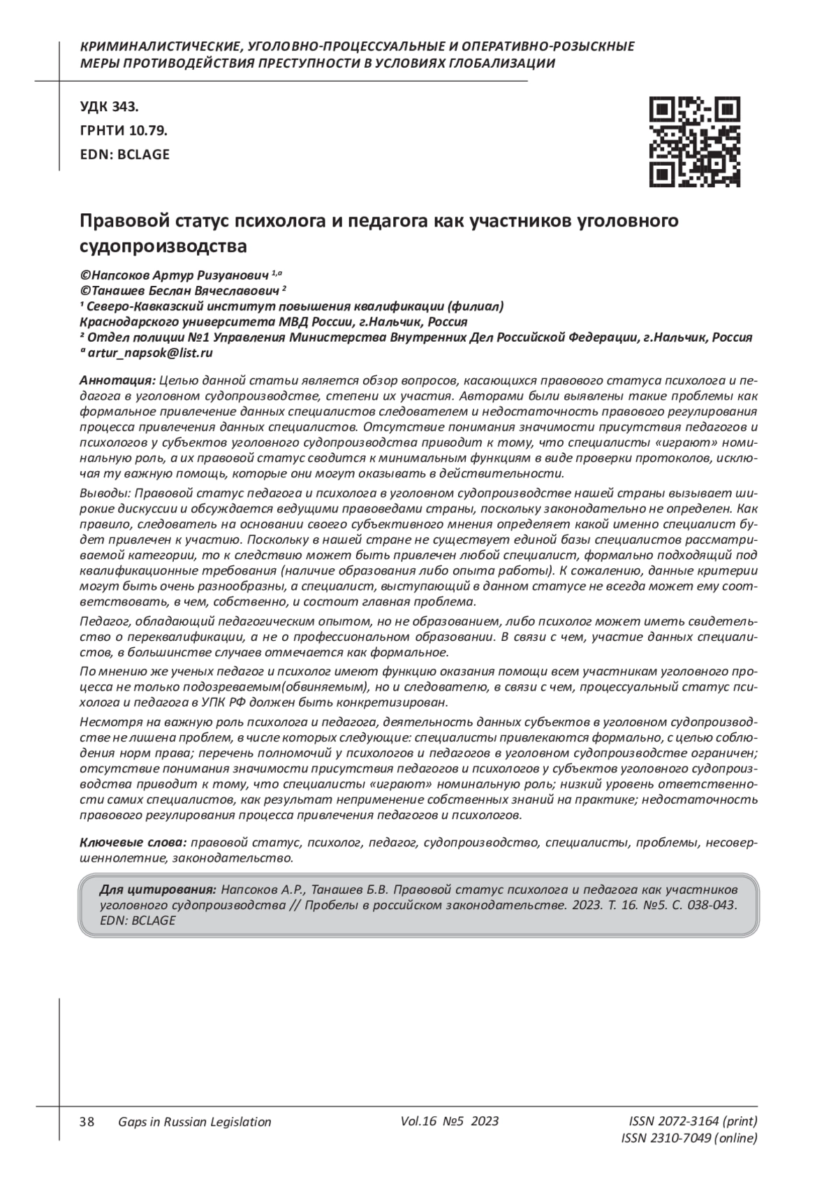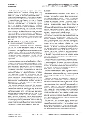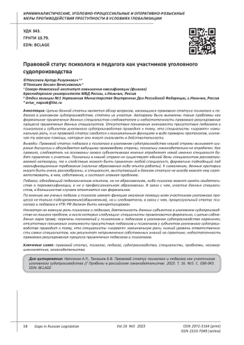 14. Храмцова В.В. Особенности правового статуса педагога и психолога как участников уголовного судопроизводства// Эксперт-криминалист. 2018. № 1. С. 32-34. EDN: YOEEAS