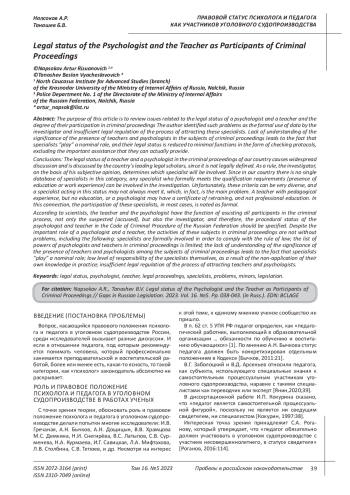 16. Шувалова М.А. Процессуальные действия психолога и педагога в уголовном судопроизводстве // Вестник ННГУ. 2019. №6. С. 196-202. EDN: ZYQMHJ