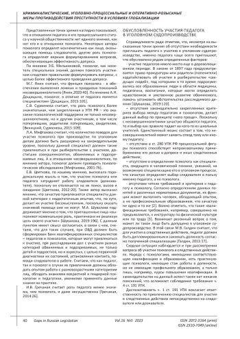18. Янин М.Г. Правовой статус педагога, психолога и законного представителя в российском уголовном судопроизводстве // Вестник Челябинского государственного университета. Серия: Право. 2020. №2. С. 39-40. EDN: OQMOIY
